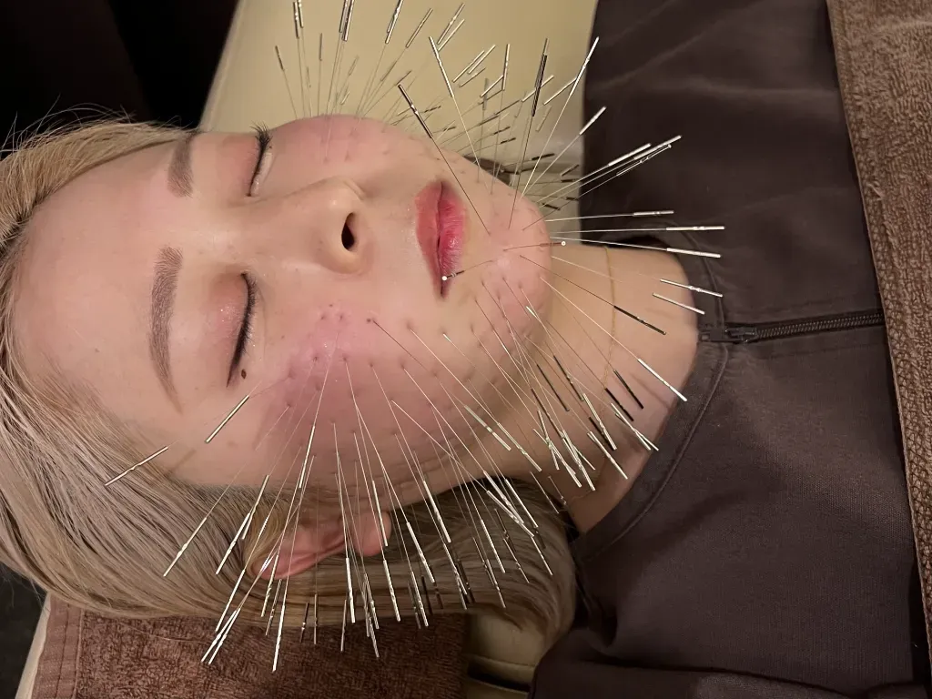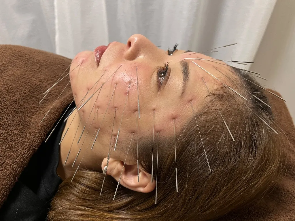 施術内容…美容鍼 悩み…おでこのシワと頬のたるみ 美容鍼はハリセンボンみたいに沢山顔面に鍼をさすイ…