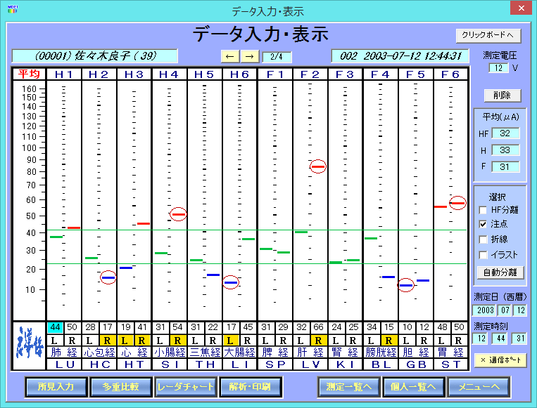 当院では、毎回の施術前に良導絡検査を行い、体の状態を視覚的に共有。