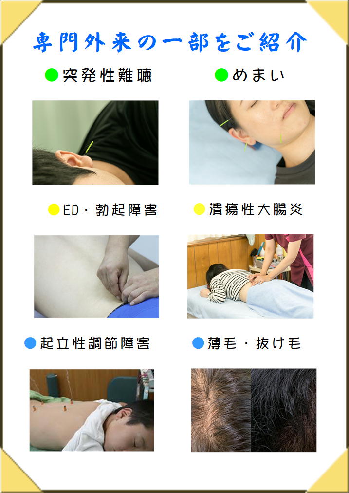 その他にも、顔面神経麻痺、過敏性腸症候群、機能性ディスペプシア、男性不妊、いぼ痔、舌根症、帯状疱疹などの特殊疾患の治療も行っております。