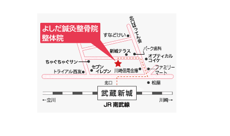 | アクセス | JR南武線武蔵新城駅の改札口は、1つです。 武蔵新城駅改札口を出ましたら、左に曲がります。 武蔵新城駅から徒歩1~2分。 左手にコージーコーナー様があり右側に松屋様がある横断歩道を渡ります。(上を見上げると北口はってん会の緑の文字の看板があります) 北口はってん会にむかって歩いてください。 ファミリーマート様と川崎信用金庫様の間をまっすぐ20m~30mを歩きます。 右手にオプティカルコイケ様がありパーク歯科様の手前の道を左に曲がると当院があります。 (当院の正面前には、しんじょうテラス様というオシャレなカフェ屋さんがあります) ★曲がり角付近の上を見上げると「よしだ整体院」の青い看板が目印♪ 当院は1階にあり、女性でも入りやすい入口になっております。 |