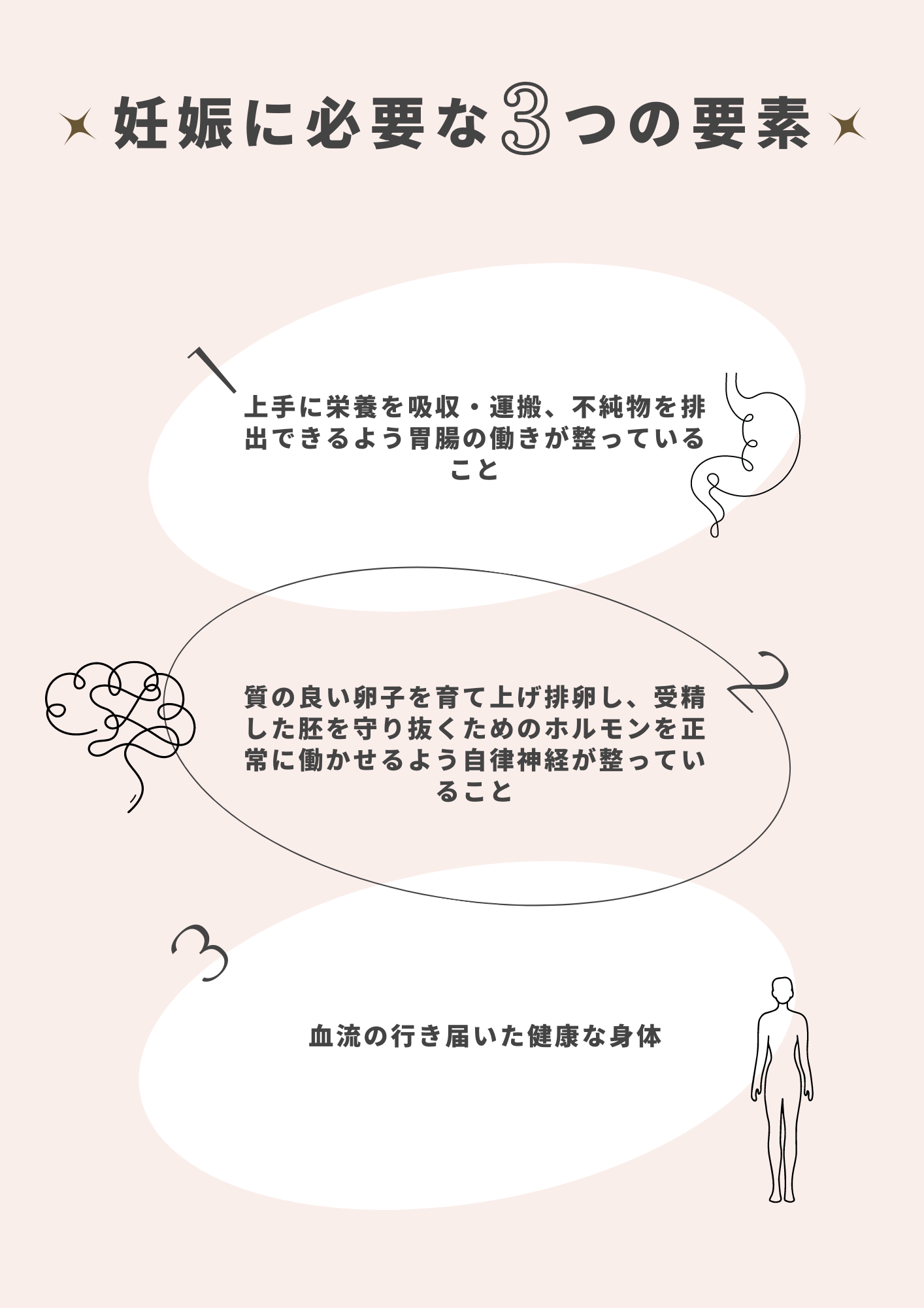 当院では、妊活に重要な「ホルモンバランス」「基礎体温」「血流」の3つを整える、オーダーメイドの施術プログラムをご用意しています。