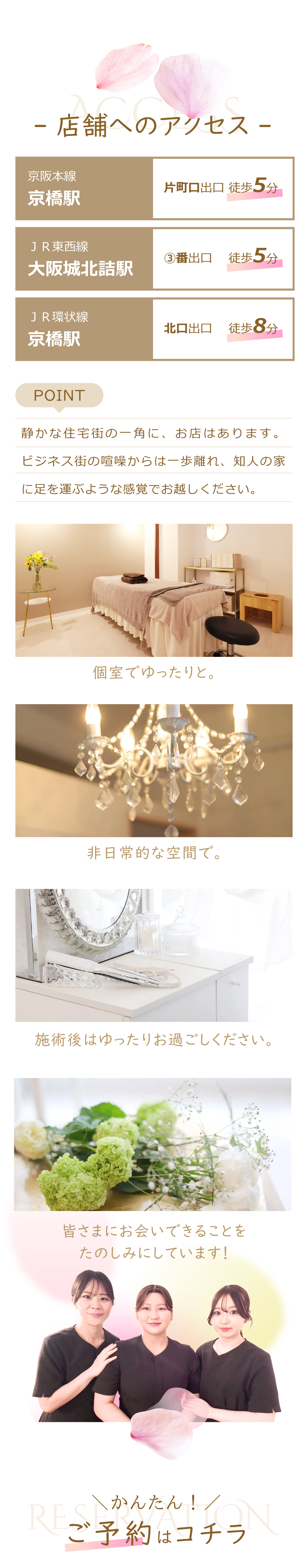 この感動を自分も鍼灸師として、同じように悩んでいる女性の方の力になりたい!と思い、女性専門のサロンで日々お客様の施術に向き合っております。
