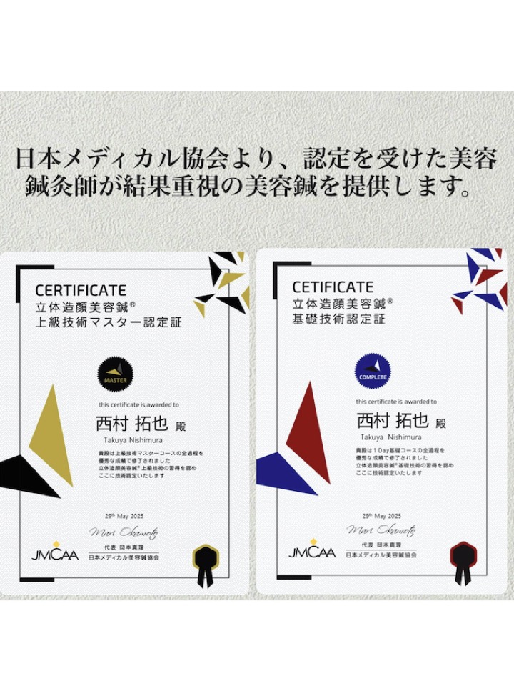 西村先生は、私が代表を務める日本メディカル美容鍼協会(JMCAA)公認技術である立体造顔美容鍼の上級技術を優秀な成績で習得され、協会認定の「上級技術マスター認定美容鍼灸師」として活躍いただいています。私たちの協会では美容皮膚科医を顧問にお迎えし、医学的知識に基づく安全で効果的な美容鍼技術を会員の皆様にも実践いただいています。西村先生の卓越した美容鍼技術で、多くの皆様に喜んでいただけることを心より願っております。