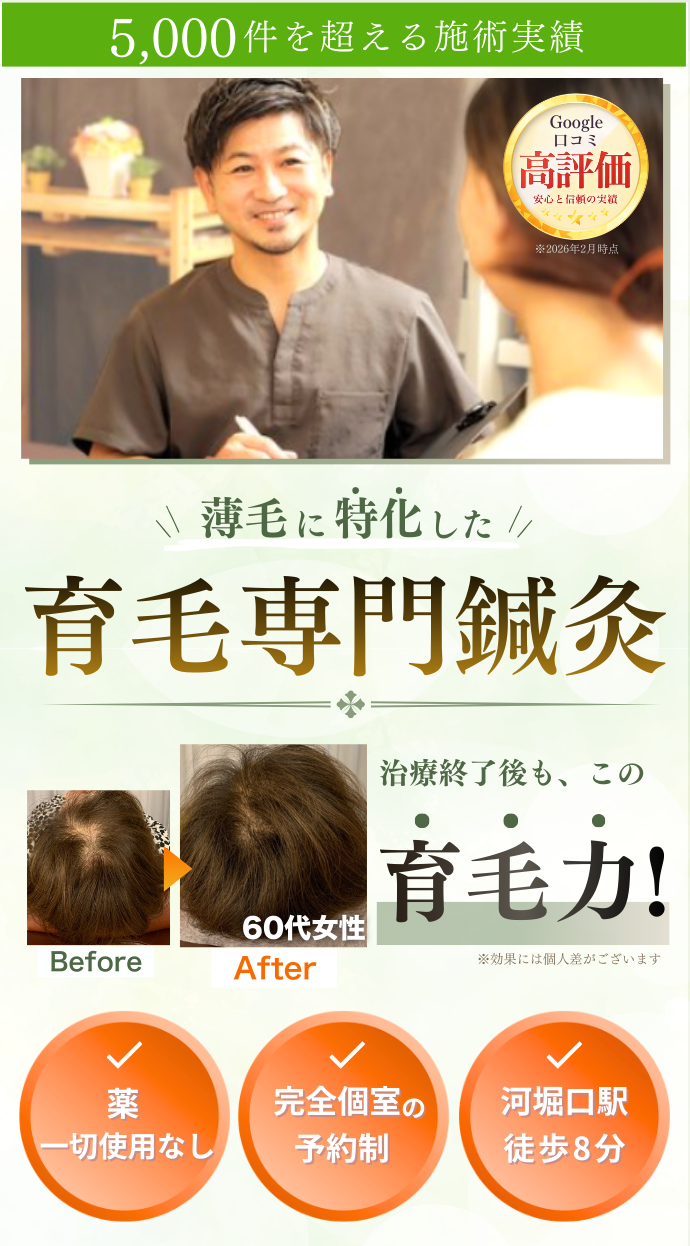 【育毛鍼灸】大阪市東住吉区・阿倍野 薄毛・抜け毛・AGAのご相談