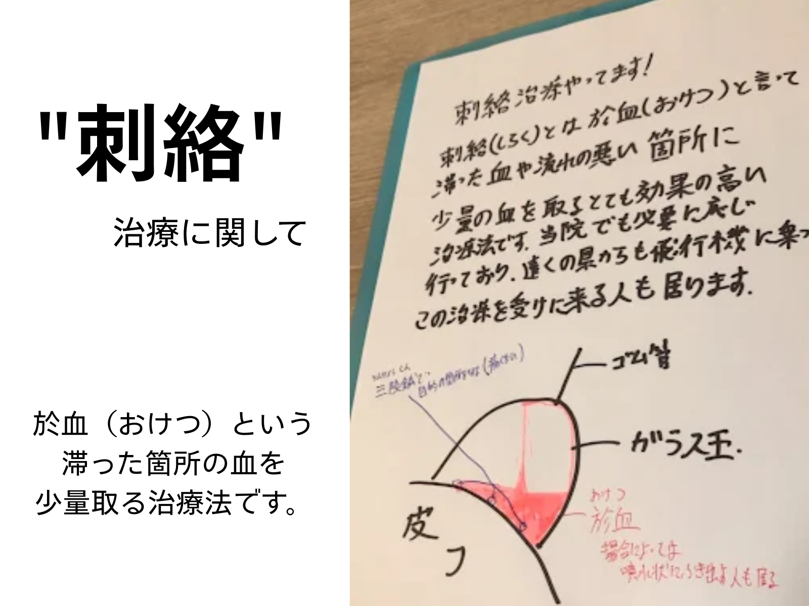 が期待できます。刺絡を探して来院される方も多く、リピート率が非常に高い施術です。