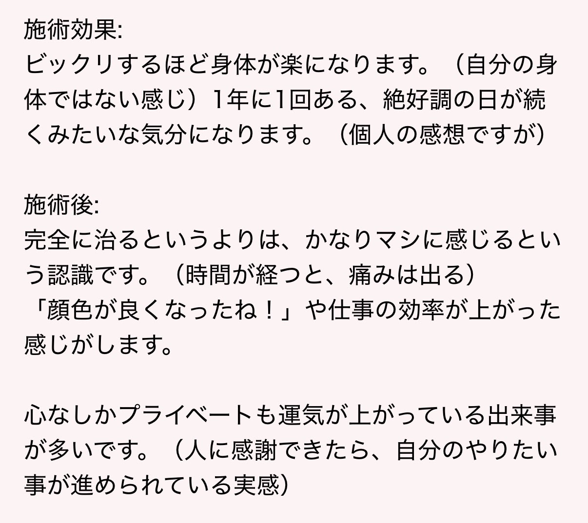 本日、2回目の施術を受けました。 経緯: 会社の上司にオススメして頂き、来訪。 元々の状態: 慢性的な寝不足・体調不良、ダルさ、腰の痛みが続いており、人の話が全く入ってこず仕事の生産性がかなり落ちている状態でした。 今までに試した事: 心療内科/内科、胃薬、他の治療院、整体、ヘッドマッサージなど様々試しましたが、中々良くならず。 施術: 施術台が温かいので、施術中も寒くならないのが嬉しいです。 あと雰囲気も過度にムーディーな感じではなく、シンプルな内装で落ち着きます。先生は、物腰柔らかい方で、ゆっくり話を聞いてくださるので、安心感あります。 施術効果: ビックリするほど身体が楽になります。(自分の身体ではない感じ)1年に1回ある、絶好調の日が続くみたいな気分になります。(個人の感想ですが) 施術後: 完全に治るというよりは、かなりマシに感じるという認識です。(時間が経つと、痛みは出る) 「顔色が良くなったね!」や仕事の効率が上がった感じがします。 心なしかプライベートも運気が上がっている出来事が多いです。(人に感謝できたら、自分のやりたい事が進められている実感) 総評: 私の場合は、自宅や会社から2時間近くかかりますが、行く価値があると思います。
