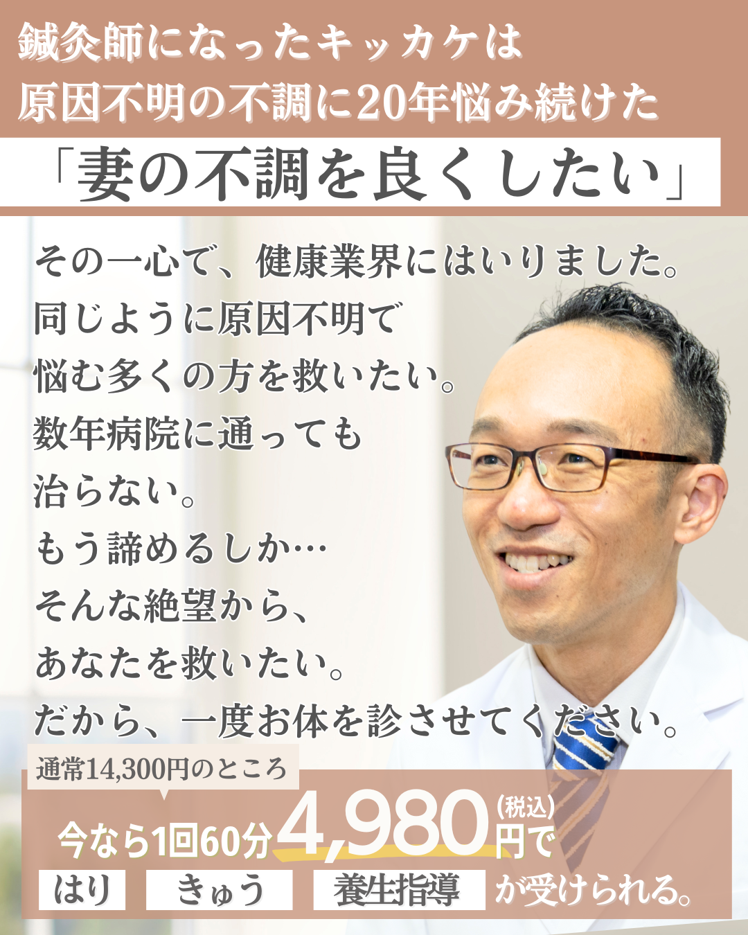 長年原因不明で苦しんだ妻のような人を救いたい。そんな街の鍼灸院