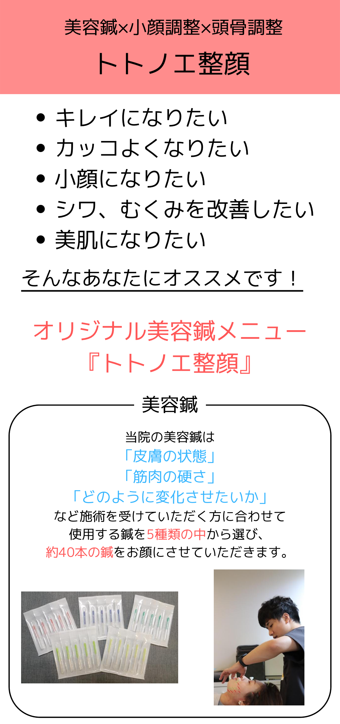 「美容鍼+小顔調整+頭骨調整」を組み合わせたメニューです。