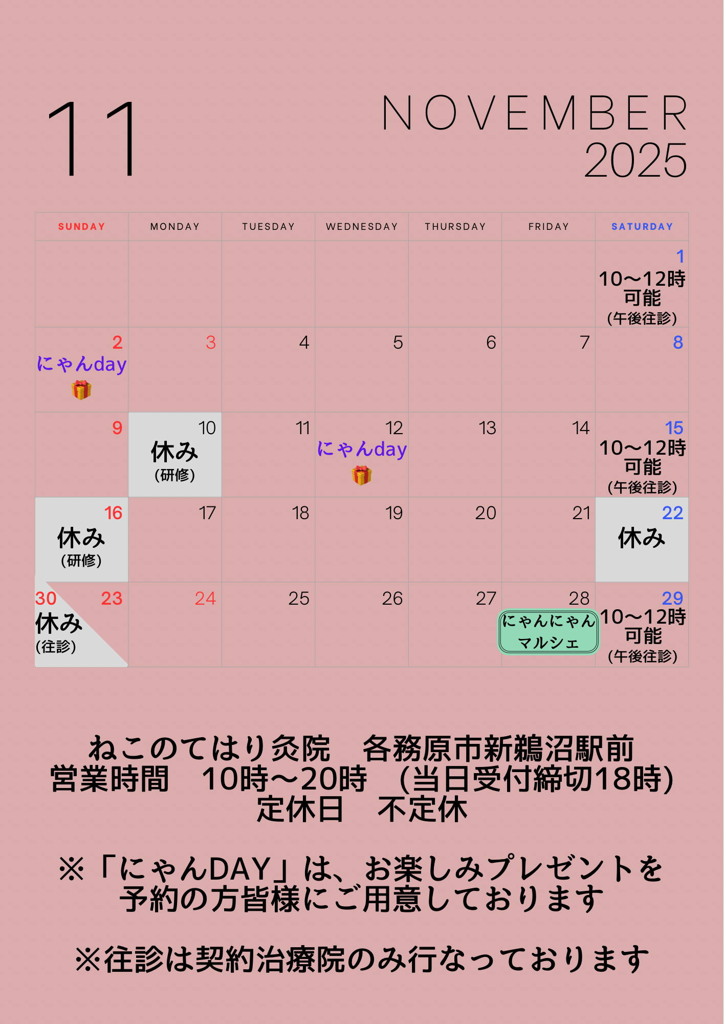 不定休(ご予約可能日は公式LINE、WEB予約でご確認いただけます) |