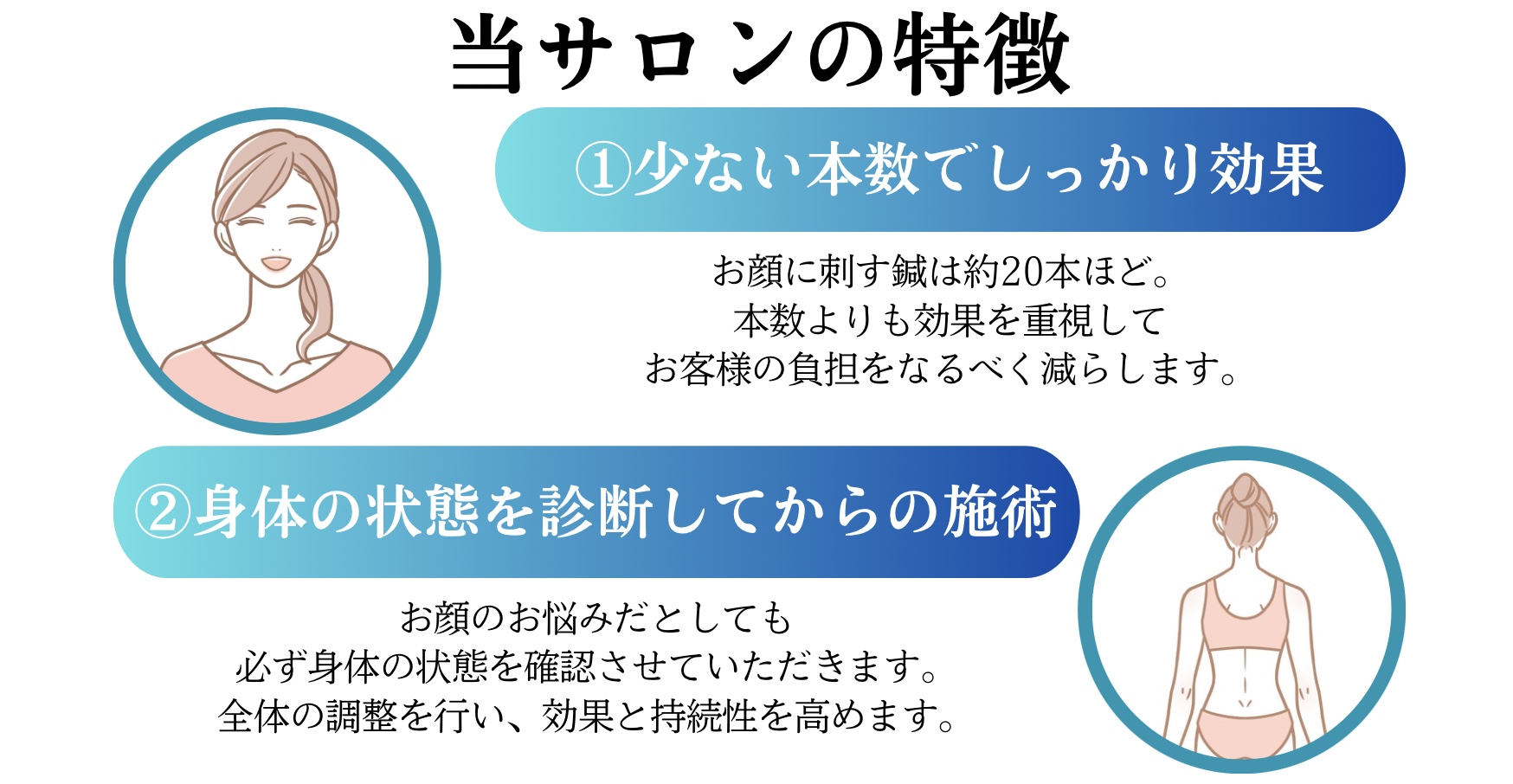 当サロンでは美容鍼を"たるみ改善"や"リフトアップ"をメインの目的にして「効かせる鍼」をモットーに施術しています。他院の平均よりも少ない本数ですが一本一本の効果を重視しています。