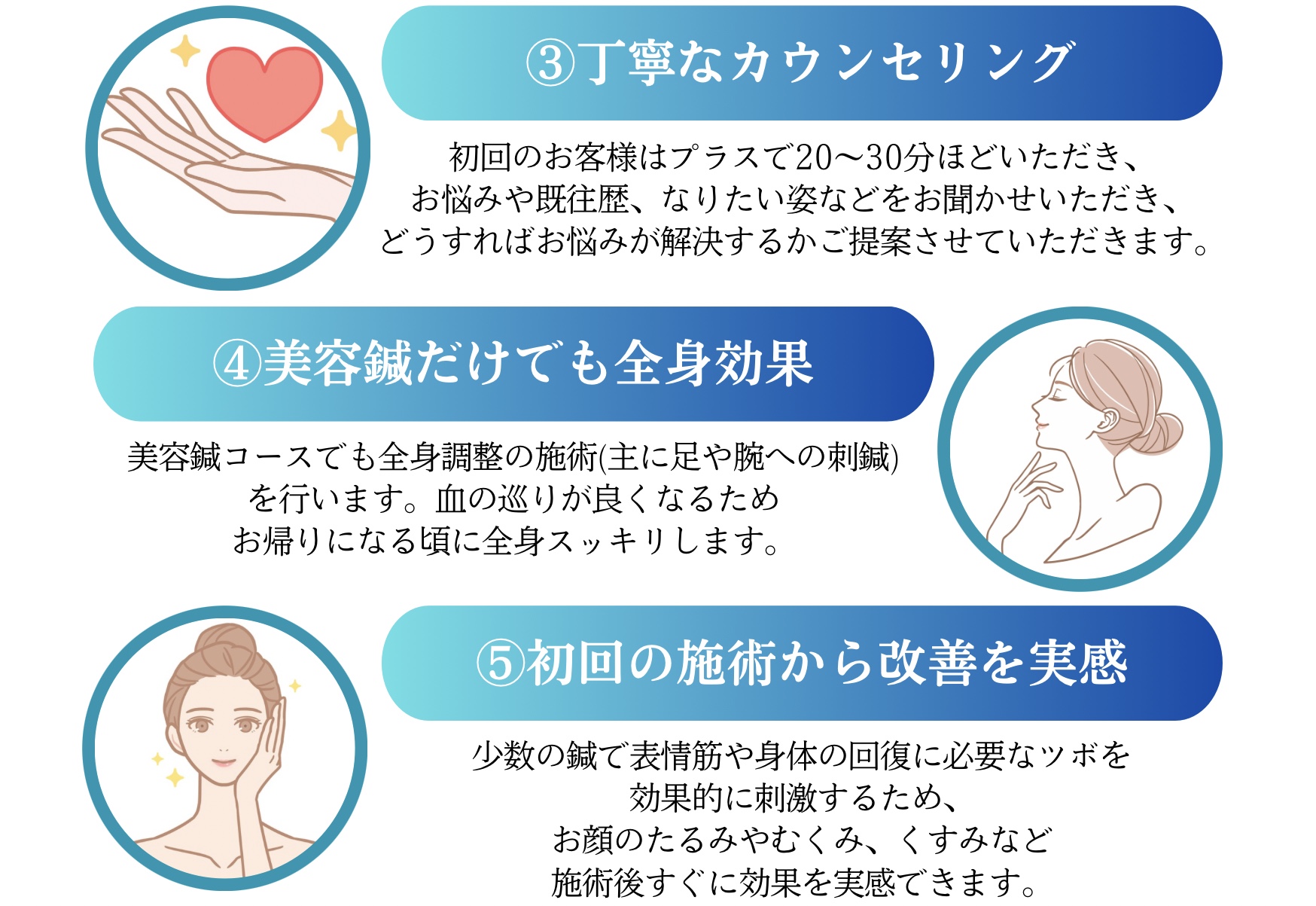 たるみに効果がある美容鍼灸と生き返るように体質から改善させる鍼灸治療が得意です。