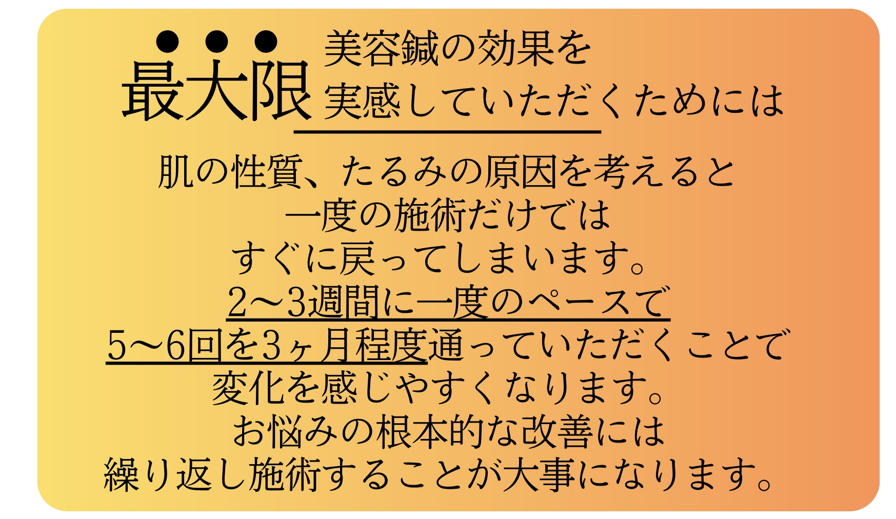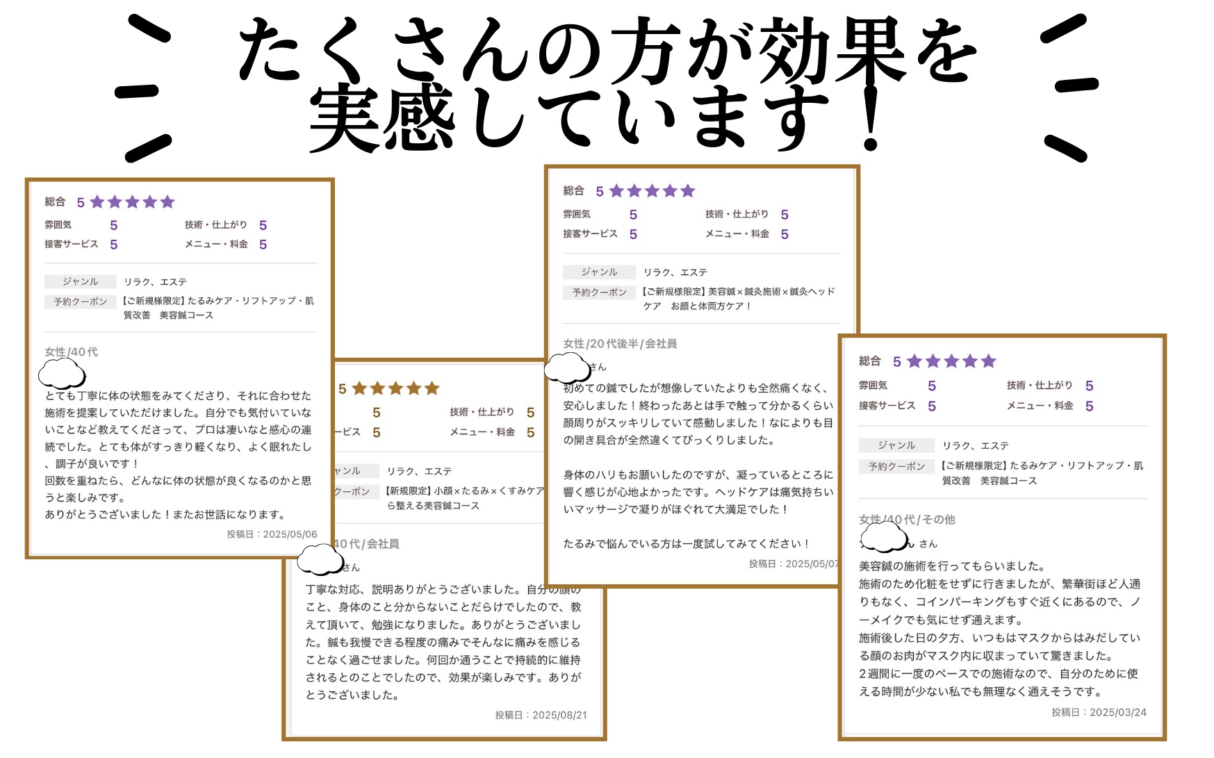 今日で4回目の施術になりますが…加齢によるたるみ、くすみ等が気になり通い始めました! 肌のトーンも上がって艷やかになりましたし化粧の乗りも良いです!それと何より小顔効果抜群です! 先生の第一印象は優しそうで穏やかな方だなぁ〜と思いましたが…その通りの方でした! 来月も宜しくお願い致します!