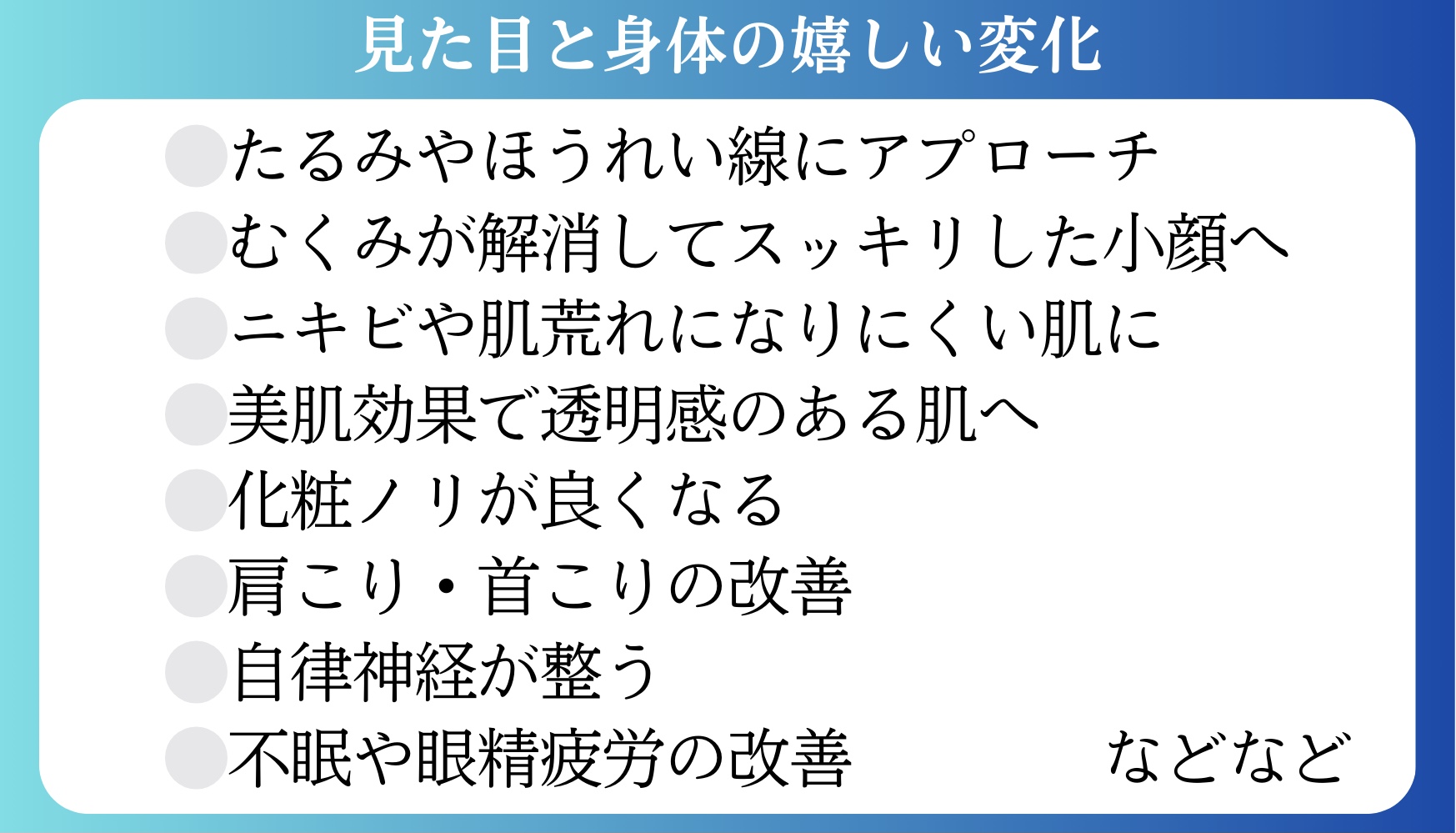 | 得意なお悩み | 肩こり / 腰痛 / たるみ(リフトアップ) |