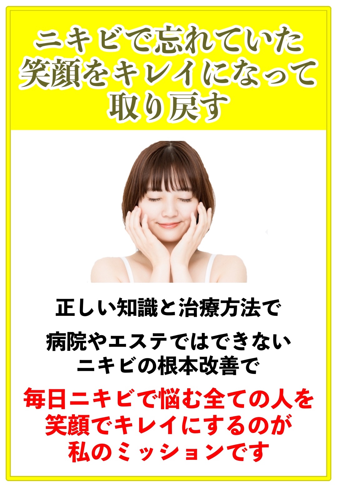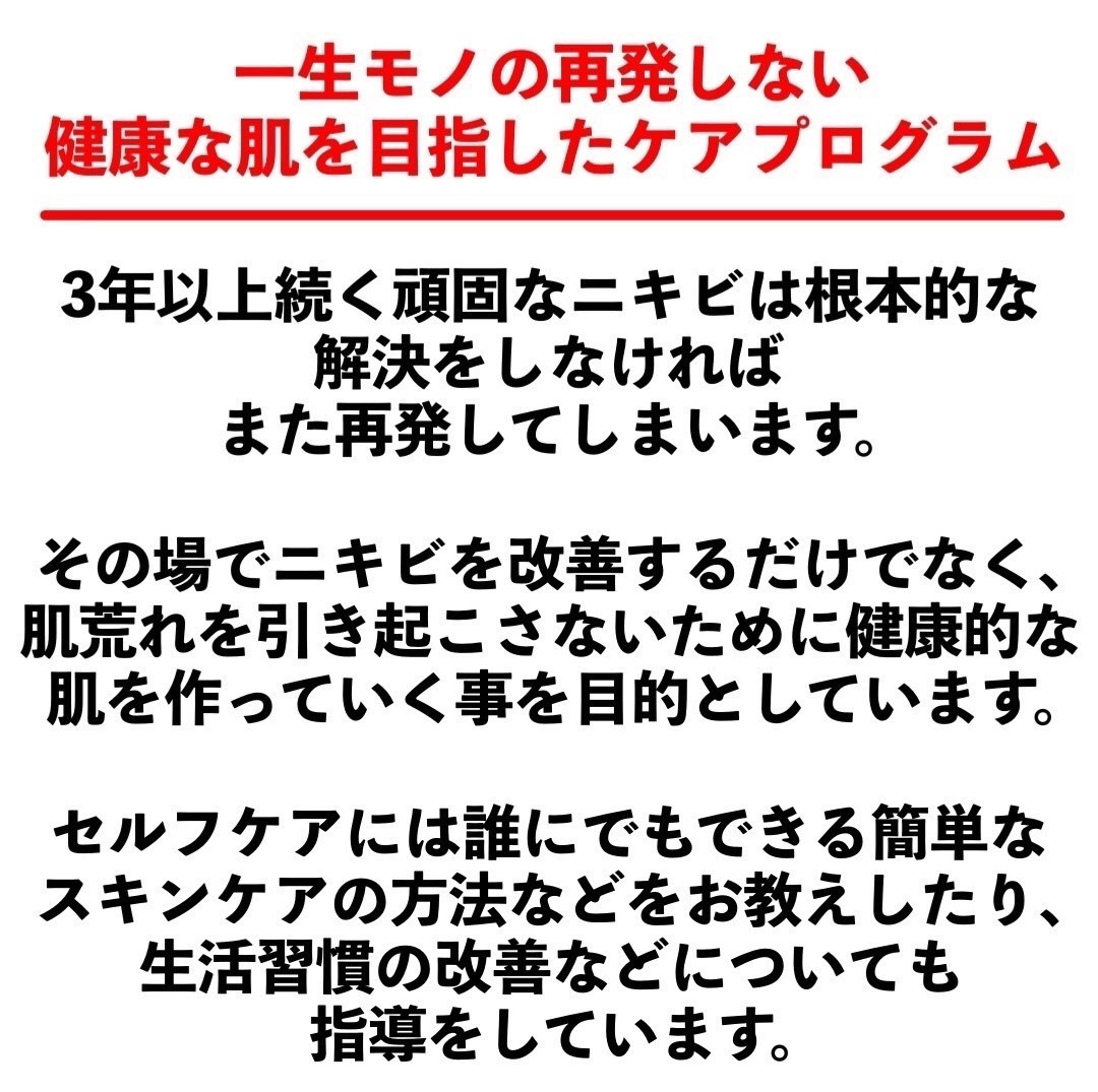 もとはニキビができていた僕の経験から、ニキビのせいで人に会えない・自分に自信が持てないなど悩みを共感できる。そして、その悩みを解決する方法をご提案できるあなたのための空間作りを目指しています