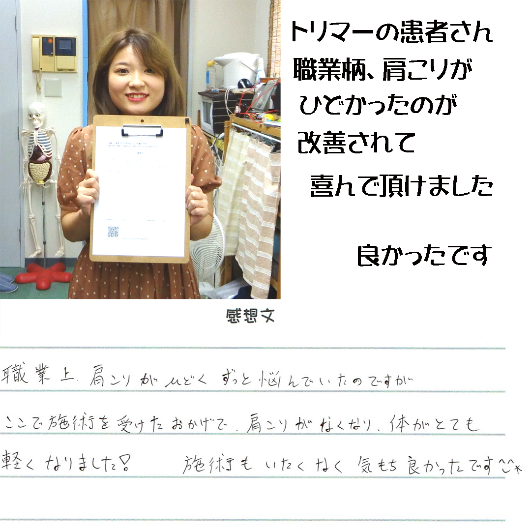 こちらに通うようになって2年半ほどになります。目まい・吐き気・頭痛・脱力感などなど、死ぬほどしんどい状態でした。わらにもすがる思いでここに来ました。1回目の施術を受けた後、目まいと吐き気がほぼなくなりました。回数を重ねるごとに以前より確実に良くなってきているのを感じています。施術を受けながら、先生とのおしゃべりも楽しみのひとつです。体調が悪い時に先生が教えて下さるアドバイスも、とても頼りになります。