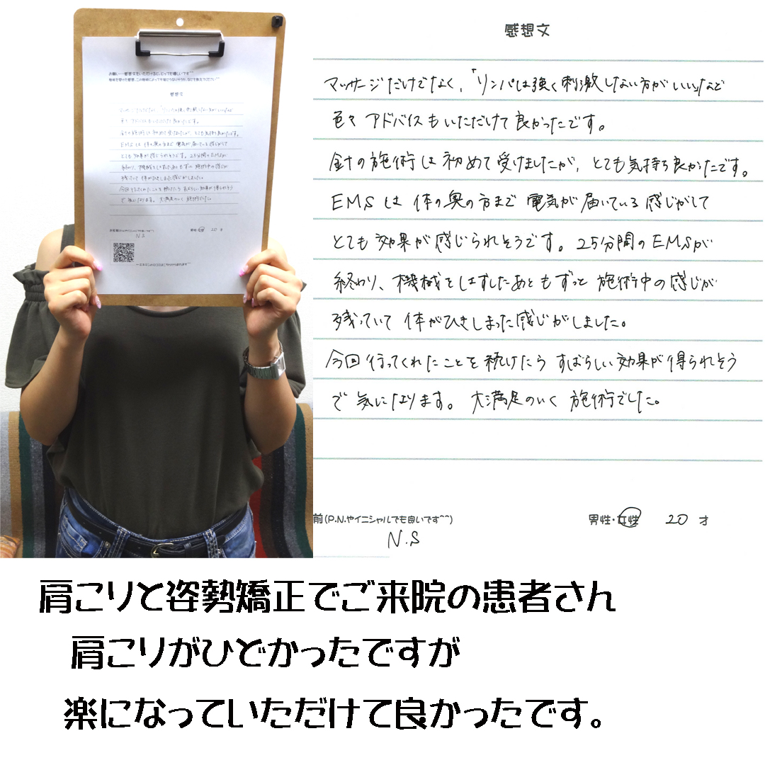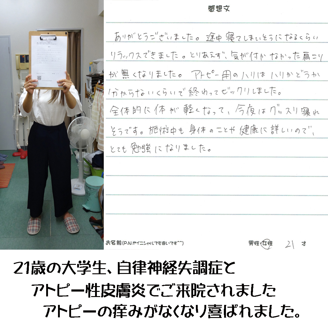数年前から自律神経失調症と診断されて心療内科に通っていましたけど、あまりよくなっていませんでした。不眠と肩こり、頭痛、気分の落ち込みがひどかったのですけど、こちらで施術を受けてから、すぐに夜はよく眠られる様になりましたし、肩こりや頭痛もなくなり、そのせいか気分の落ち込みもなくなりました。 施術後とても気持ち良く、しかも他の所ではしてもらった事のない自律神経の検査もしてもらえたので、とても安心して施術を受ける事ができました。今は気になる症状はあまりありませんけど、これからも月に1回は予防のために施術は受けたいと思っています。