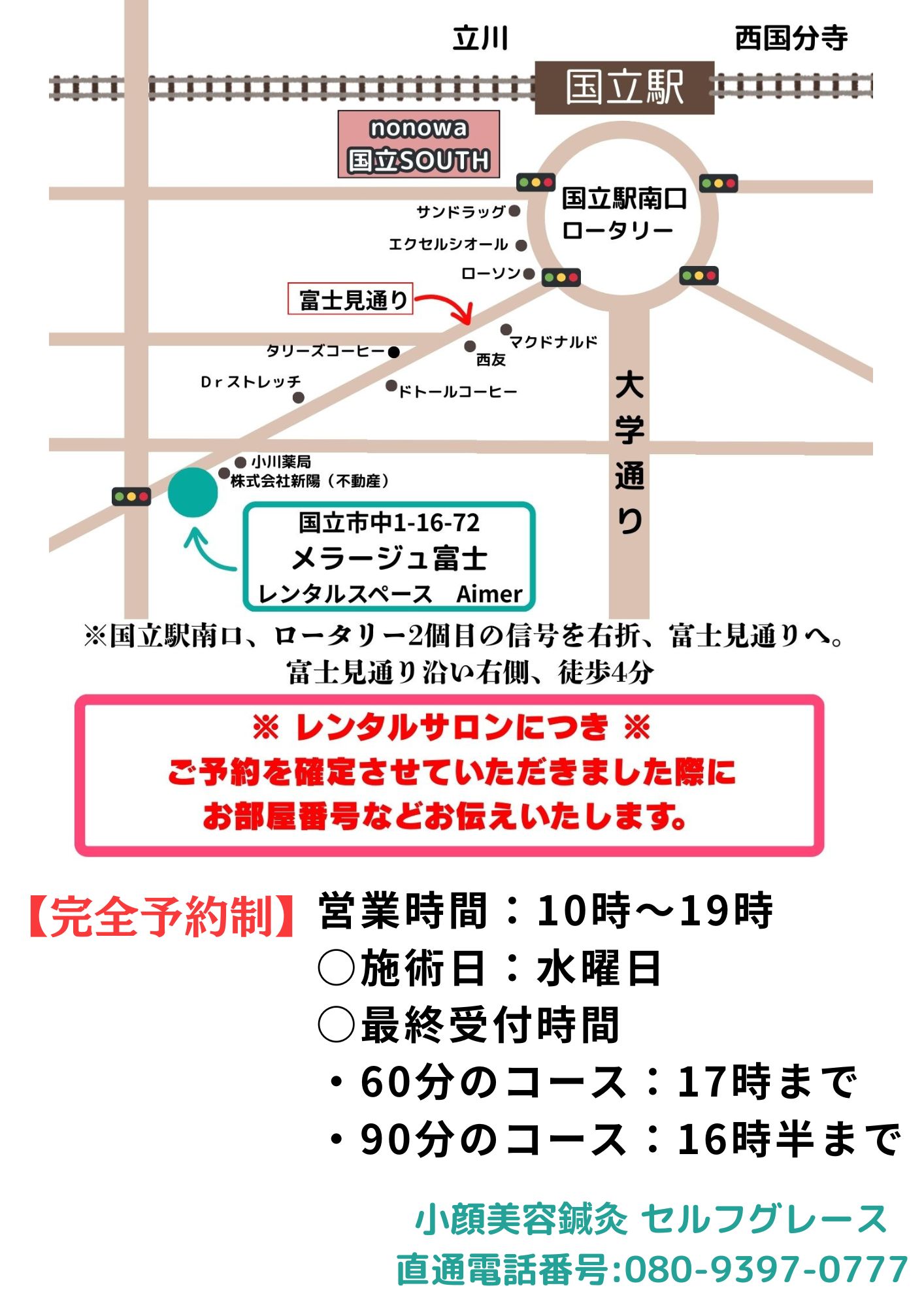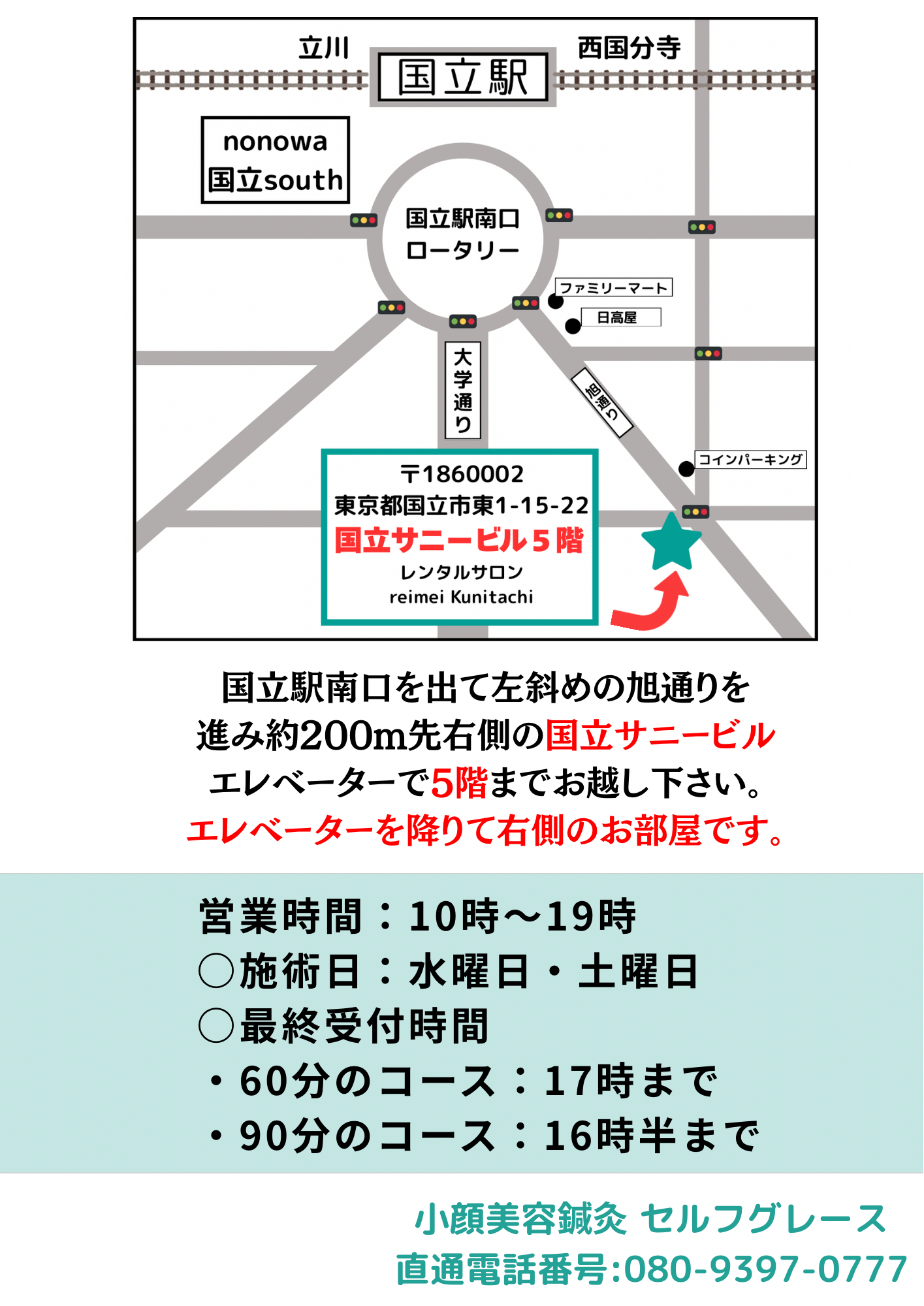 🌷水曜・土曜:国立駅南口徒歩3分🌷 レンタルサロン【reimei Kunitachi】 ※国立のご予約は、鍼灸コンパスネット予約・LINE又は お電話 【08093970777】 へお願いいたします。 ⚠️こちらはレンタルサロンとなりますので、ご予約し無しのご来店はご遠慮くださいますようお願いいたします。 🌻火曜・金曜:立川ルミネ7階🌻 リラクゼーションサロンgreenroom 立川のご予約は、LINE又はお電話 【08093970777】へお願いいたします。 |