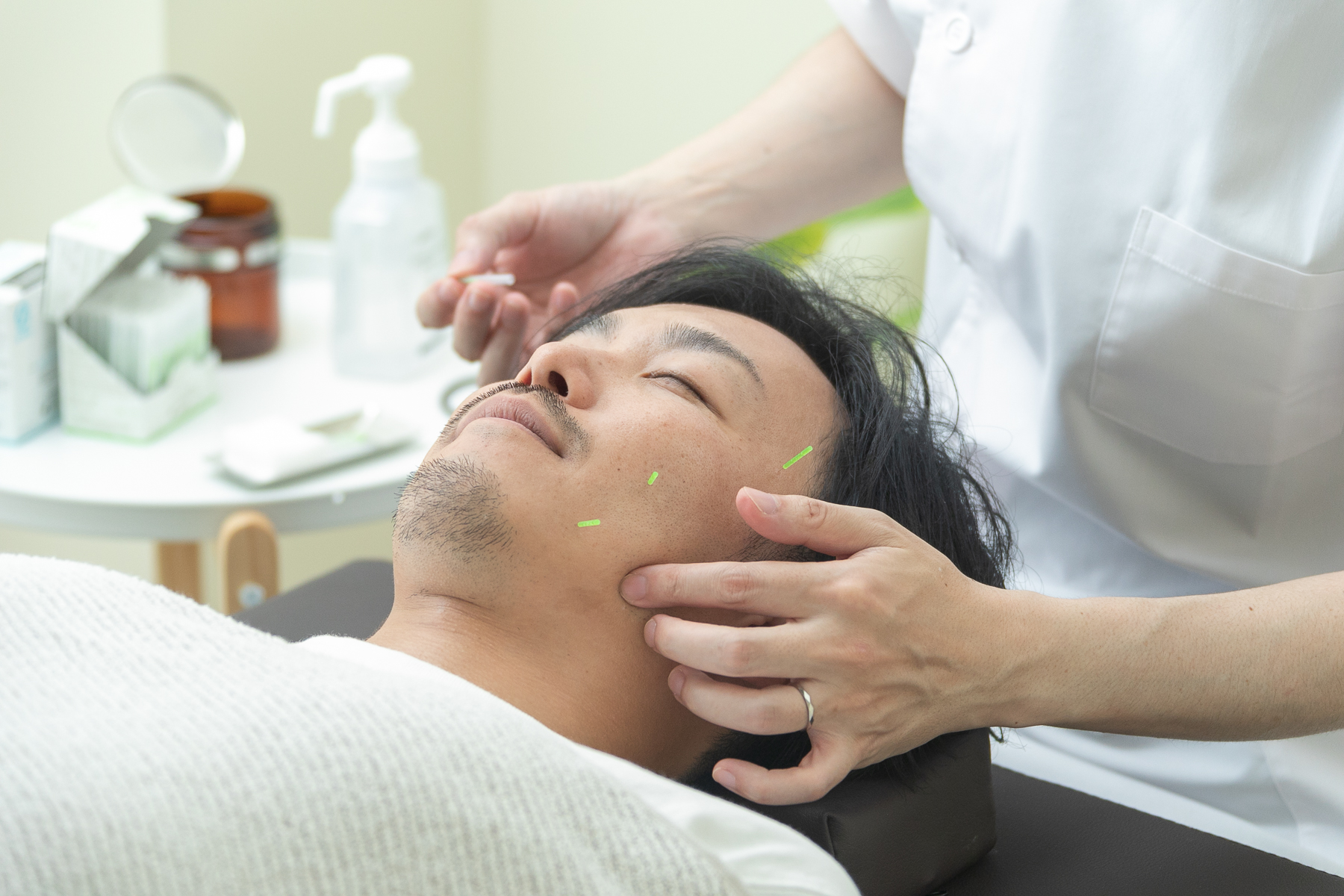 お顔に鍼を打つことで血流を誘導し、さらにヘッドマッサージで頭部全体をほぐしていくため、施術後はお顔全体がスッキリする効果を実感して頂けると思います。