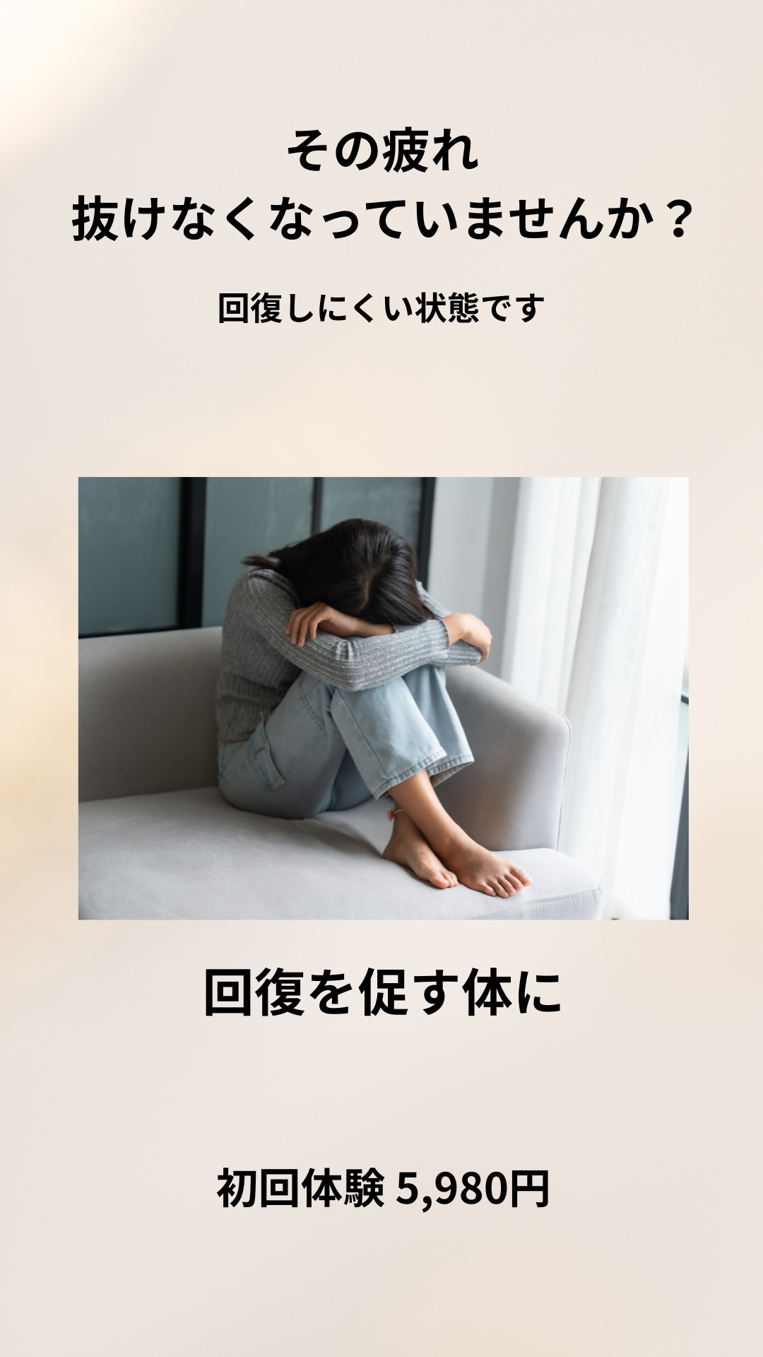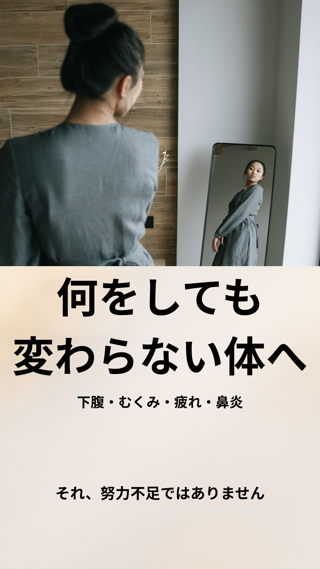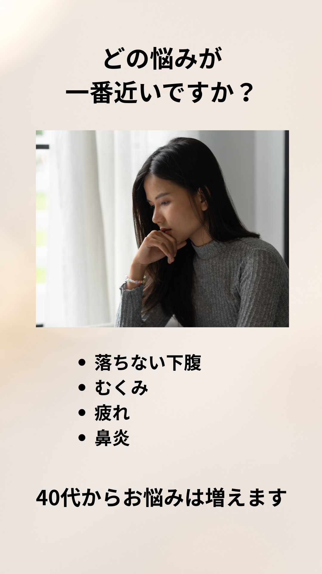 40代になると身体に色々な変化がおきます。代謝が落ちる、痩せない、寝れないなど誰にも分からない悩みあると思います。まずは相談してください。体の内側から底上げし時間はかかるかもしれないが戻らない体へ。