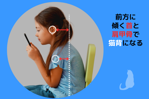 しかし、多くの場合「猫背になっている気をつけよう」と言われているのは、背中そのものが丸くなっているということより、首の位置と肩甲骨の位置の悪さのことを指していることが多いです。