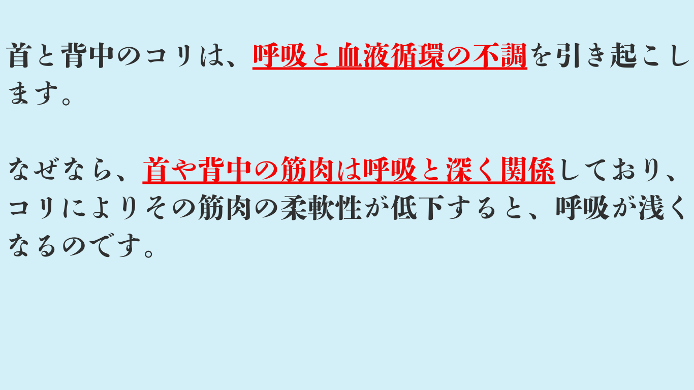 自律神経の乱れによる不調は、身体のコリ(特に首と肩のこり)が根本原因です。根本原因を解消することで、呼吸と血液循環を整え症状を改善していきます。