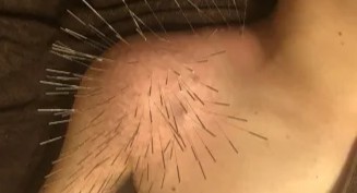 この症状の場合、ルート治療では沢山の太い鍼を頭のコリの部分にうっていきます。