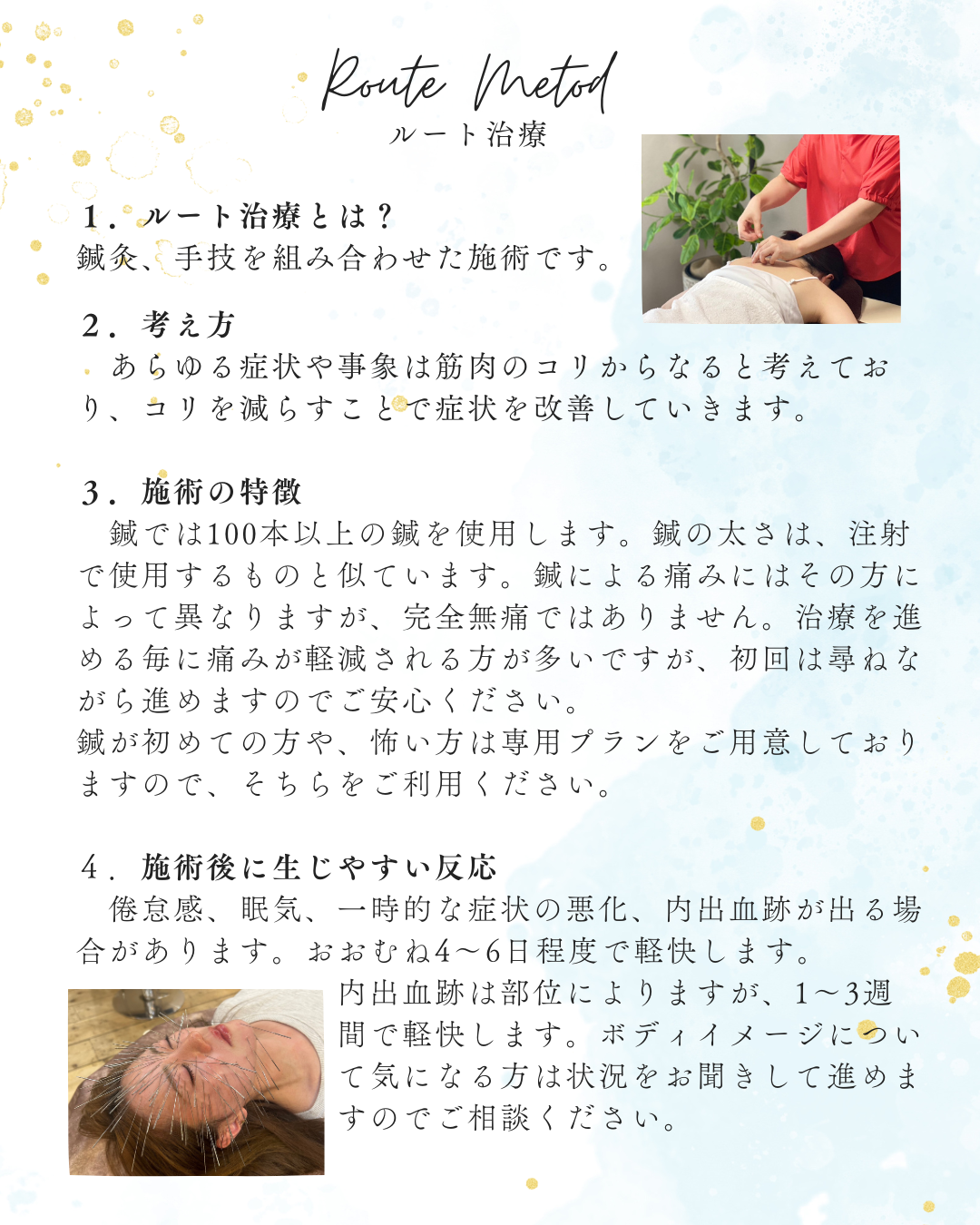 ルート治療は痛みがゼロではありません。しかし、痛みを無視したりもしませんし、我慢しなくても構いません。パフォーマンスを向上させたい、変えたい、症状を治したいと思う御心に私も精一杯お応えします。