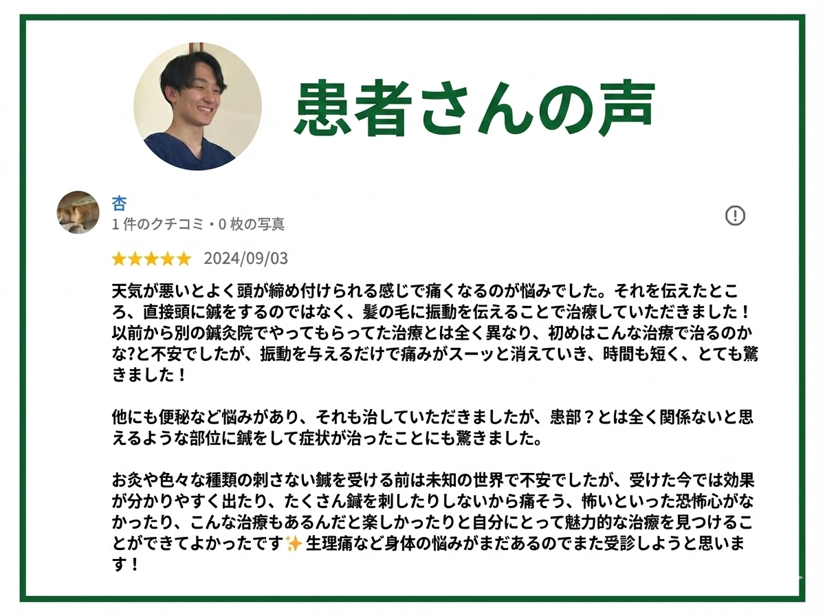 頭痛で来店しました。 刺さない針の新感覚を体験したのですが、イメージしていたものより遥かに効果があり、また来店したいと思いました。 細かい症状の説明も分かりやすく丁寧にしていただき、とても楽になりました。