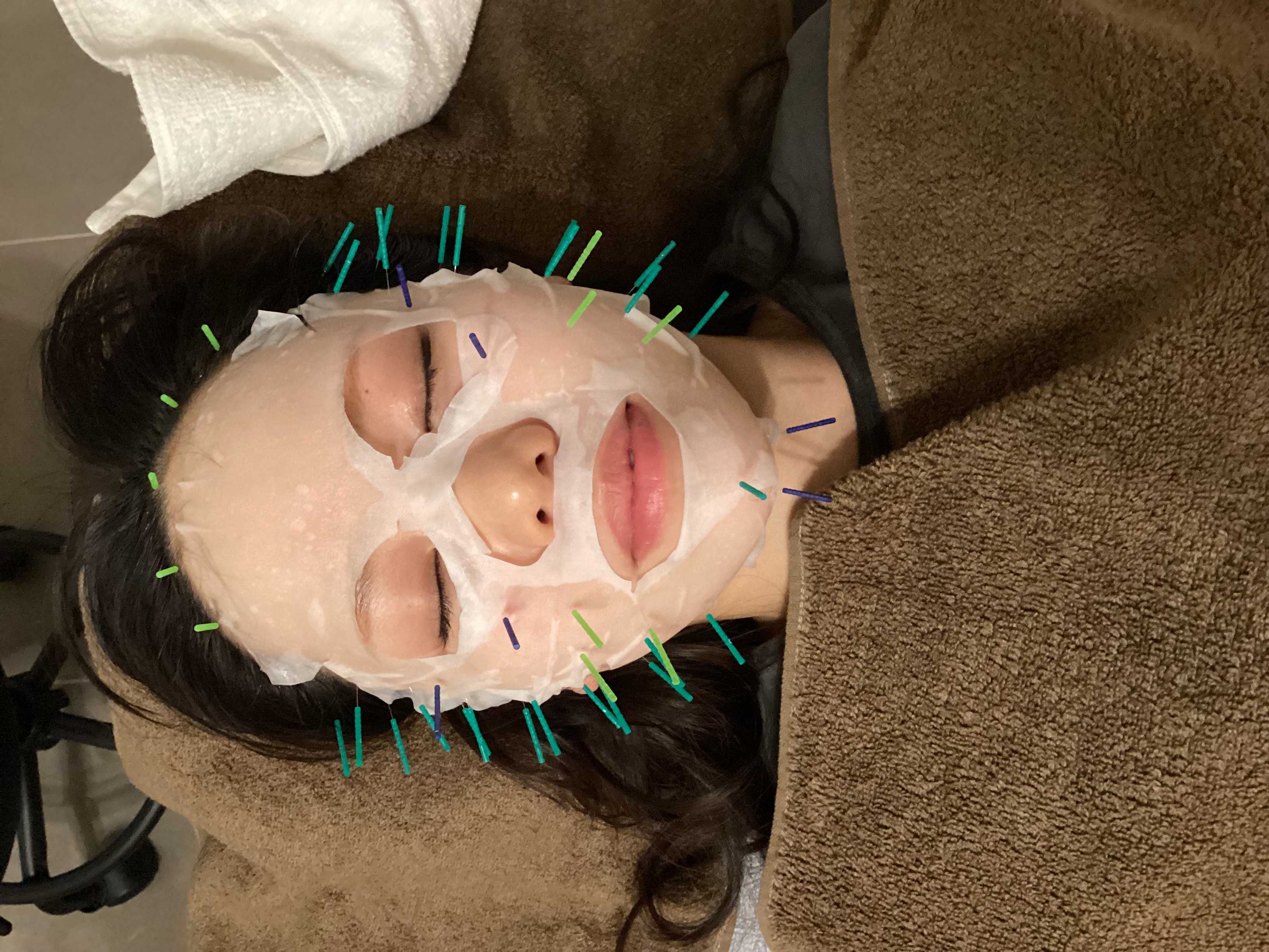 美容パックの上から鍼灸施術:施術中にパックをしながら美容鍼を行います。