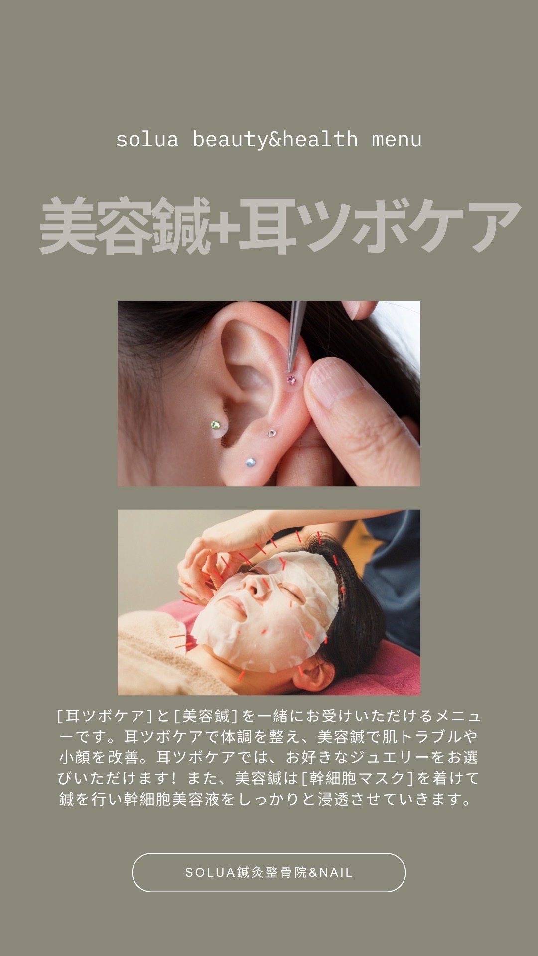 という部分を大切にしており、「美容」の面におきましては耳ツボケアと美容鍼を中心に行っております!