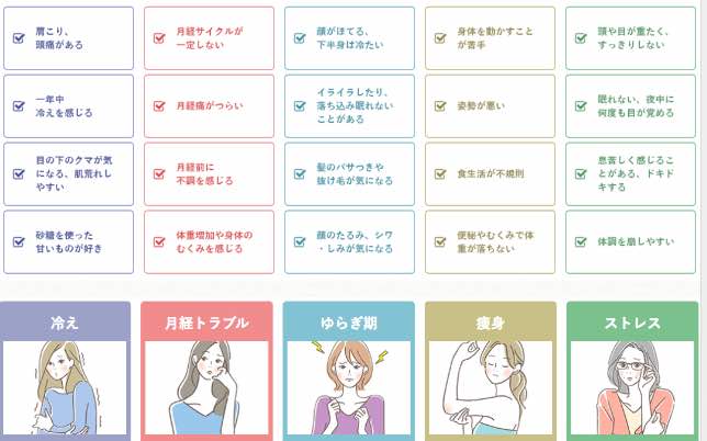 冷え、月経トラブル、ホルモンバランスの乱れからくる不調、更年期症状、