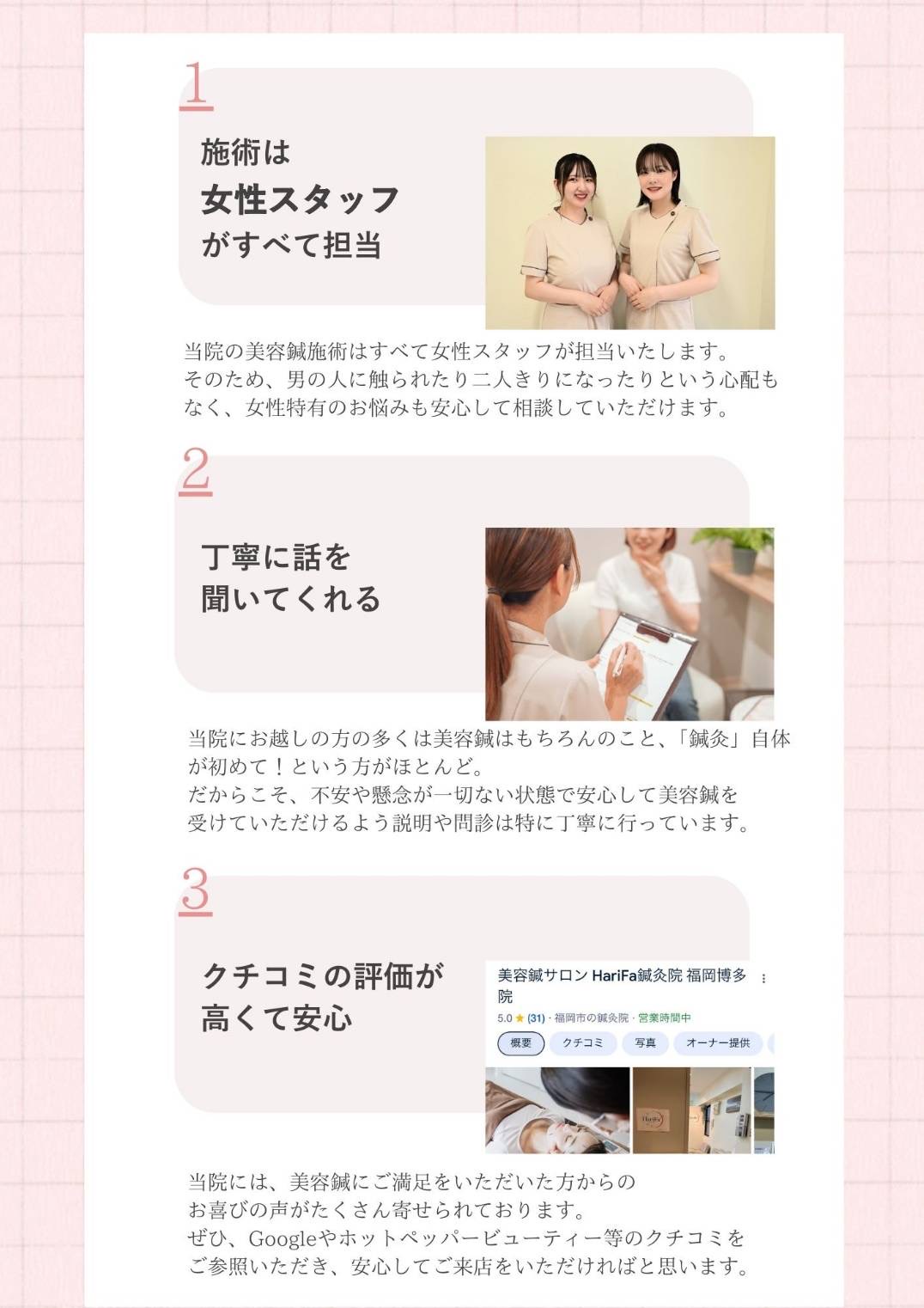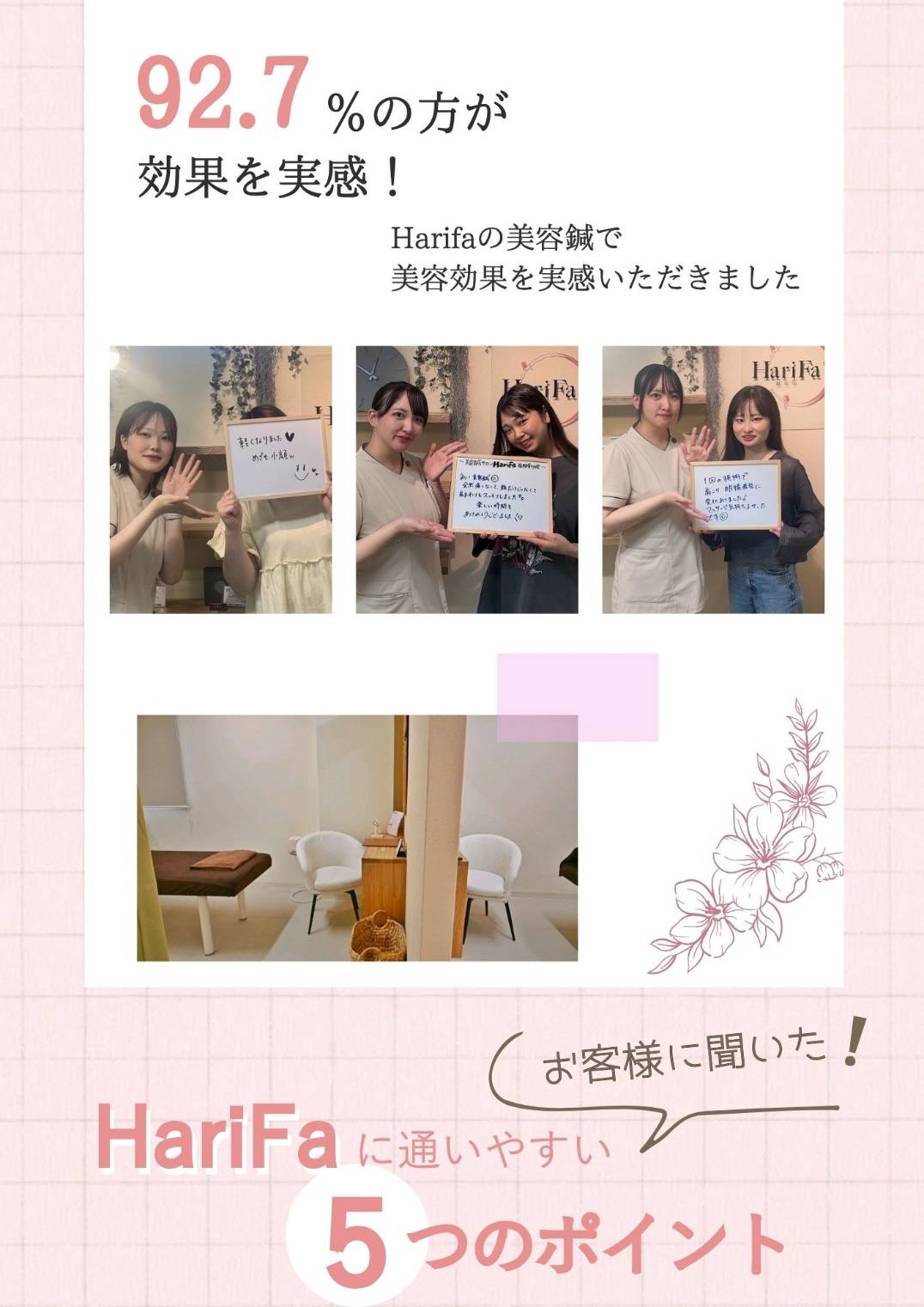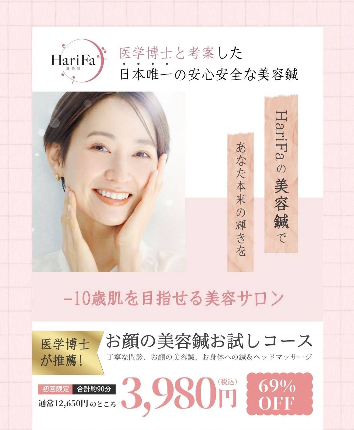 HariFa(ハリファ)はお顔のたるみ、ニキビや乾燥肌などあらゆる肌のトラブルを改善し、あなたの美肌つくりのサポートをする美容鍼の専門鍼灸院です。