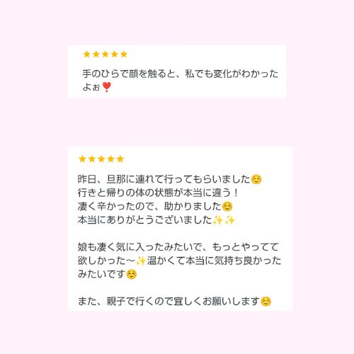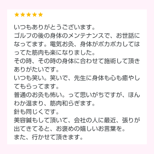 そんな嬉しいお声もいただいており、これからもそう仰っていただける鍼灸院を目指しています。
