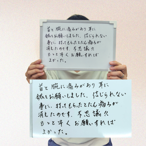 鍼灸という技術のすばらしさはもちろんですが、施術して下さった先生が、私が「不調の自分」に対して抱えている不安や憤りを、ゆっくり聴いて下さったこと。この二つが相まって、改善へとつながったと感じています。