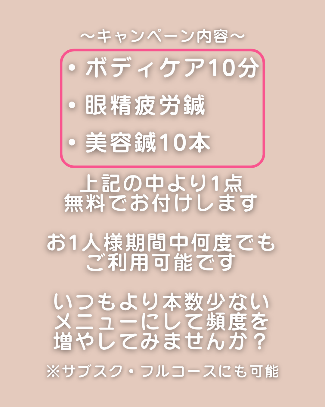 | ご予約に関して | 複数メニュー希望の際は美容鍼・電気美容鍼を優先し、他メニューはオプションで選んでください。 |