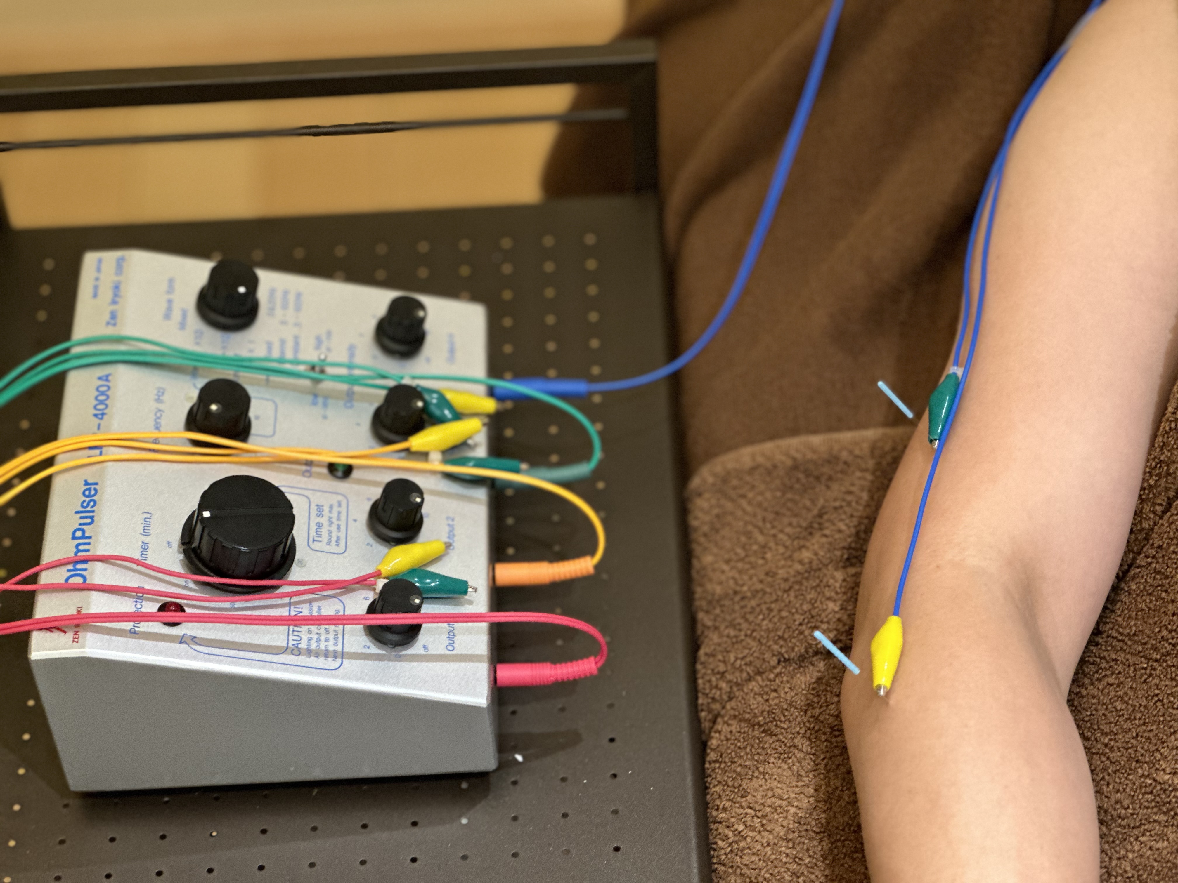 坐骨神経の支配領域に痛みが出ている可能性が高かった事から、障害部位そのものと坐骨神経に対し、鍼通電療法を行いました。