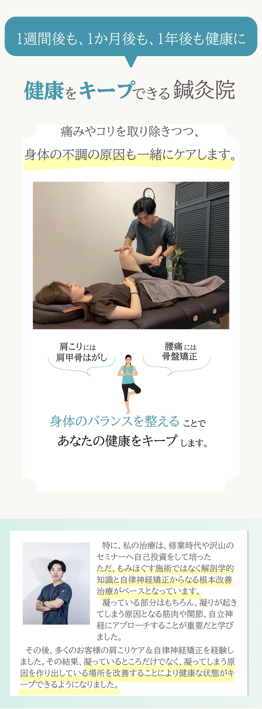 筋肉を緩める、揉み解すだけではなく、国家資格保持の身体のスペシャリストがあなたのお悩みを分析して「その場しのぎ」ではなく【根本改善】に導くために一緒に伴走いたします。