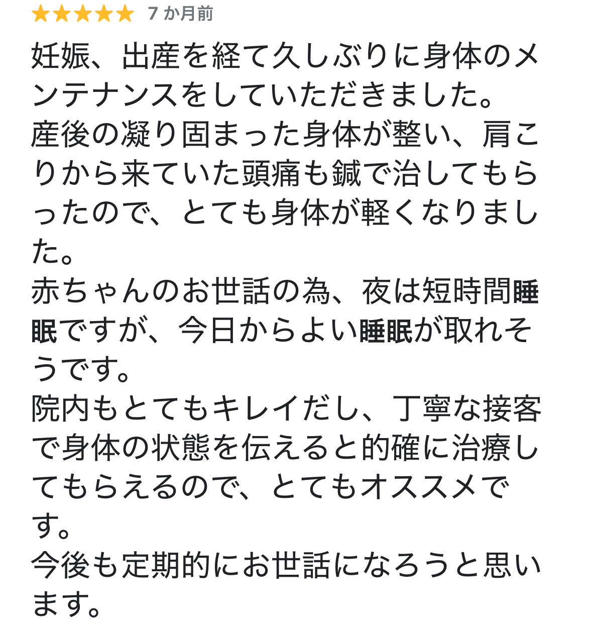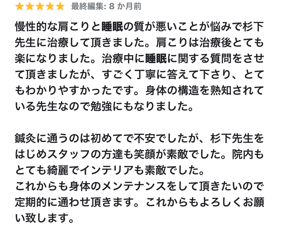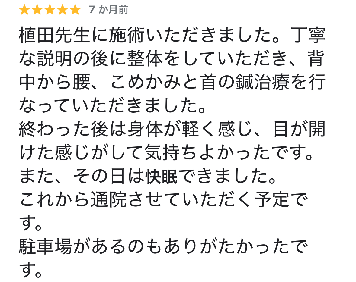 私は睡眠のことで施術を受けに行ったのですが、自分の悩んでいるところをどうすれば改善できるのかというのを、図を書いたり自分の経験談を交えて説明してくれたり、知識がない私にも分かりやすいように色々と教えていただいて助かりました。 それにとても話しやすかったので、少し緊張してましたが、すぐほぐれちゃいました。 また、鍼が初めてだったので、どのくらい痛いんだろう…?と少し怖いなと思っていた部分もあったんですが、実際に受けてみると思ったより全然痛くありませんでした。鍼が入ってるっていう感覚は分かるんですけど、そこまで痛いとはならなかったです。 こういったところで施術を受けたことがなかったため不安はあったのですが、対応も施術も丁寧だったので、ここにして良かったなと思っています。