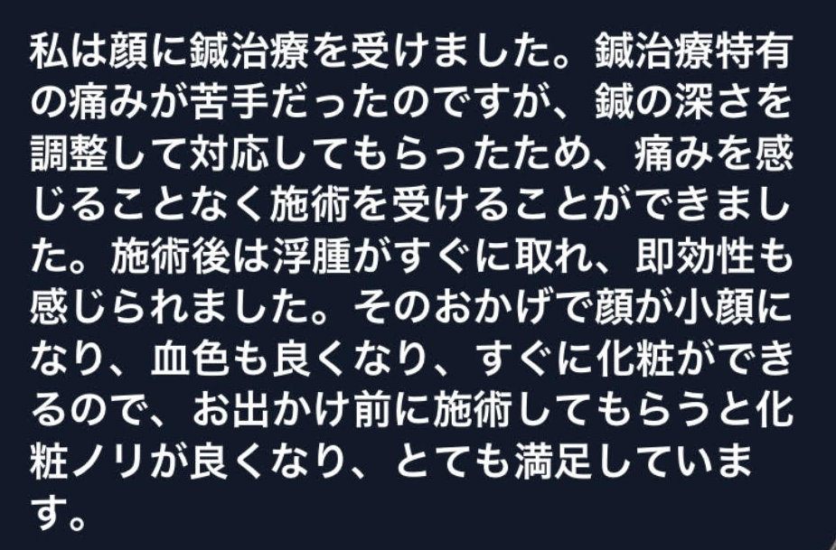 鍼灸はこれまで経験がなく鍼治療は痛みなどが心配でしたが、痛みは全く感じることなく、顔の鍼治療は赤ら顔が施術後すぐに落ち着き、フェイスラインもむくみがすっきり取れた実感がありました。 肩と腰の凝りも気になっていましたが、鍼とマッサージで凝りと痛みがかなり改善しました。施術後1週間程経ちますがまだ効果は続いています。是非また治療を受けさせて頂きたいです。ありがとうございました^_^