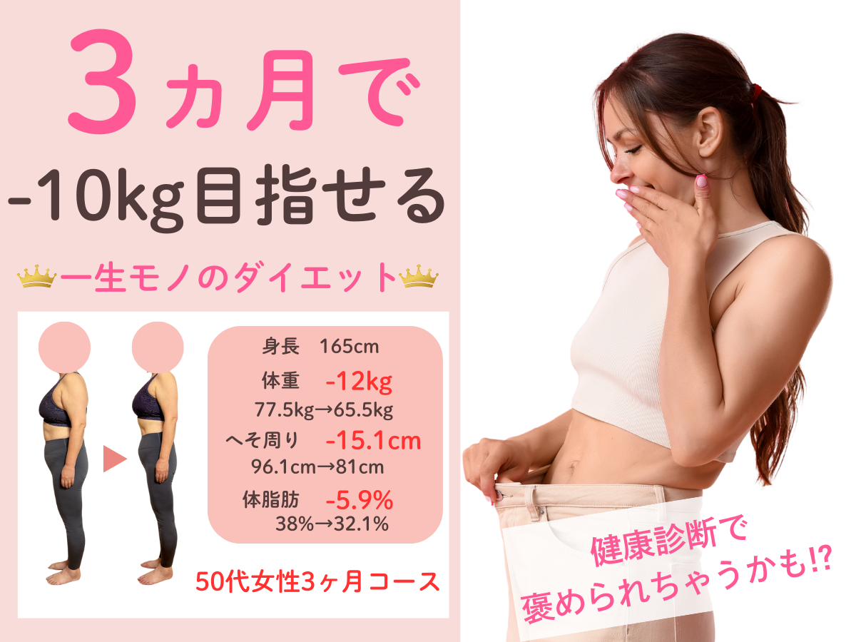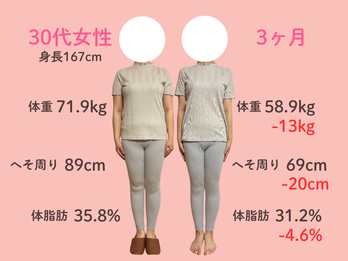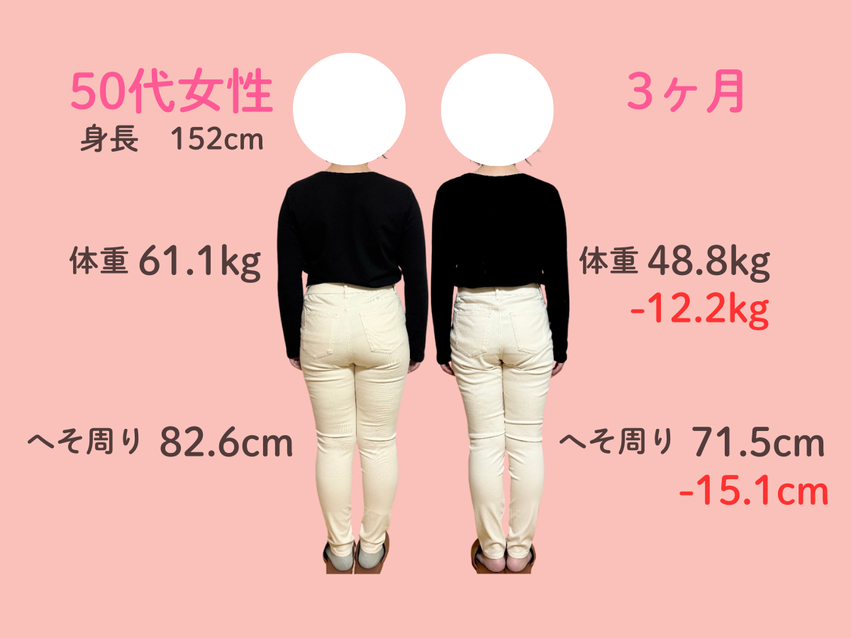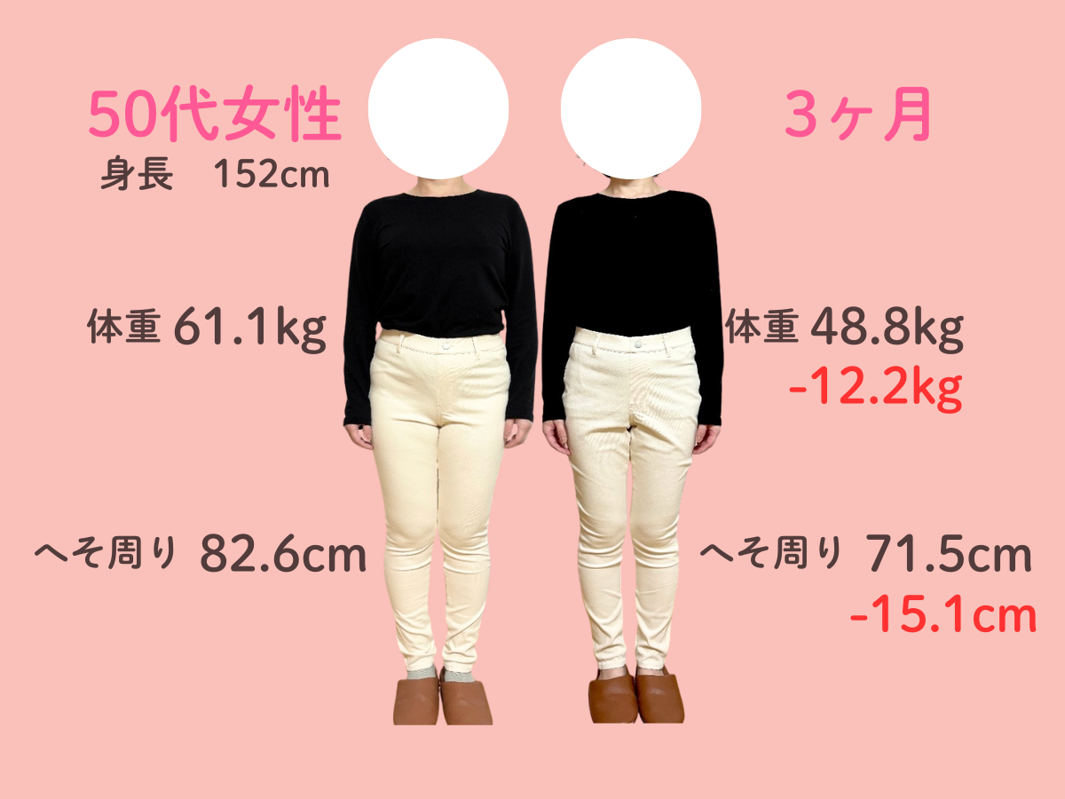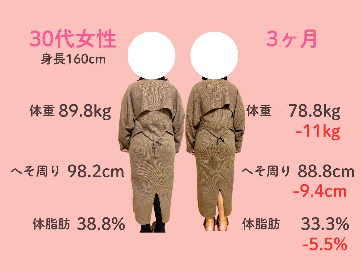 お腹の脂肪が多く体重が増え続けて、太っているためTシャツ等ピタッとするものが着れなくなって悩んでいました。 自分では運動やウォーキングを始めのに体重にも体型にも変化はありませんでした。 そんな時に、チラシで3ヶ月10kg痩せるという言葉を見てすぐに来ました。 食事制限が厳しくなくて、何でも食べることができて薬やサプリメントの服用がなかったこともよかったです。 3ヶ月終わってみると、体重がどんどん落ちて嬉しかったです。 体全体がひとまわり小さくなりました。 洋服のサイズもLLからLかMが着れます。お腹のぜい肉が取れて体が楽で動きやすいです。人前に出ても体型での恥ずかしさがなくなりました。 この調子でもう1ヶ月頑張ってみることにしました!
