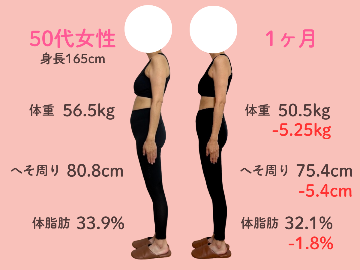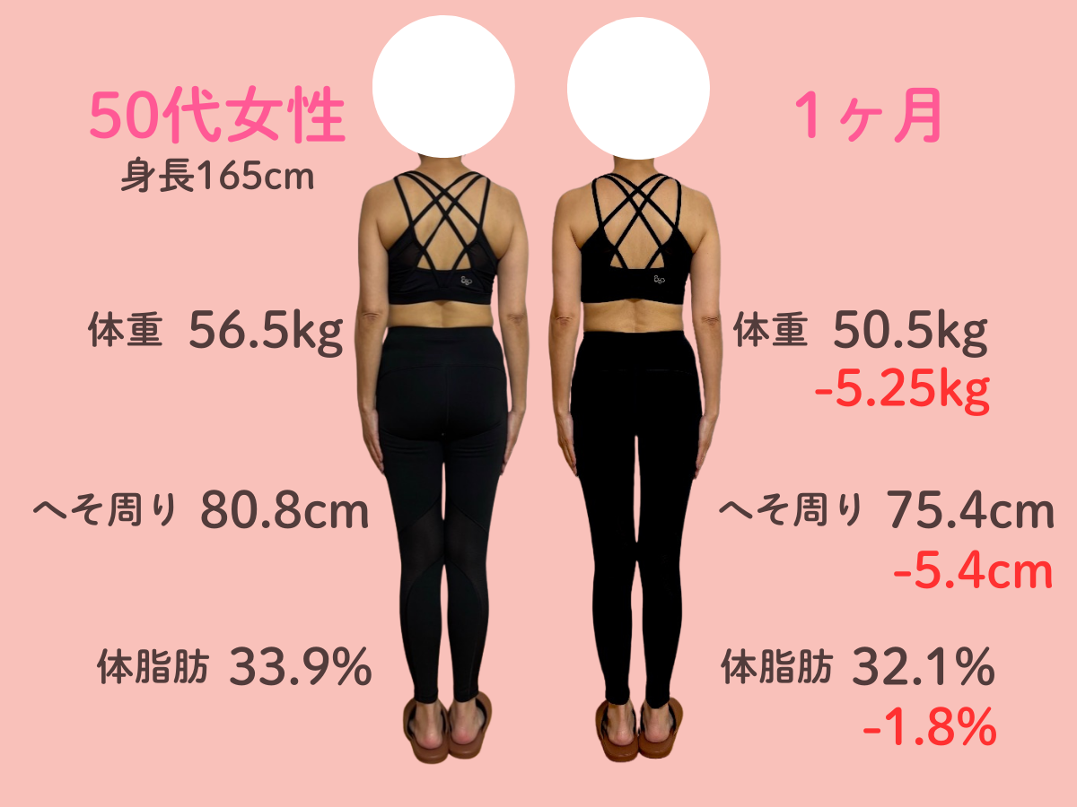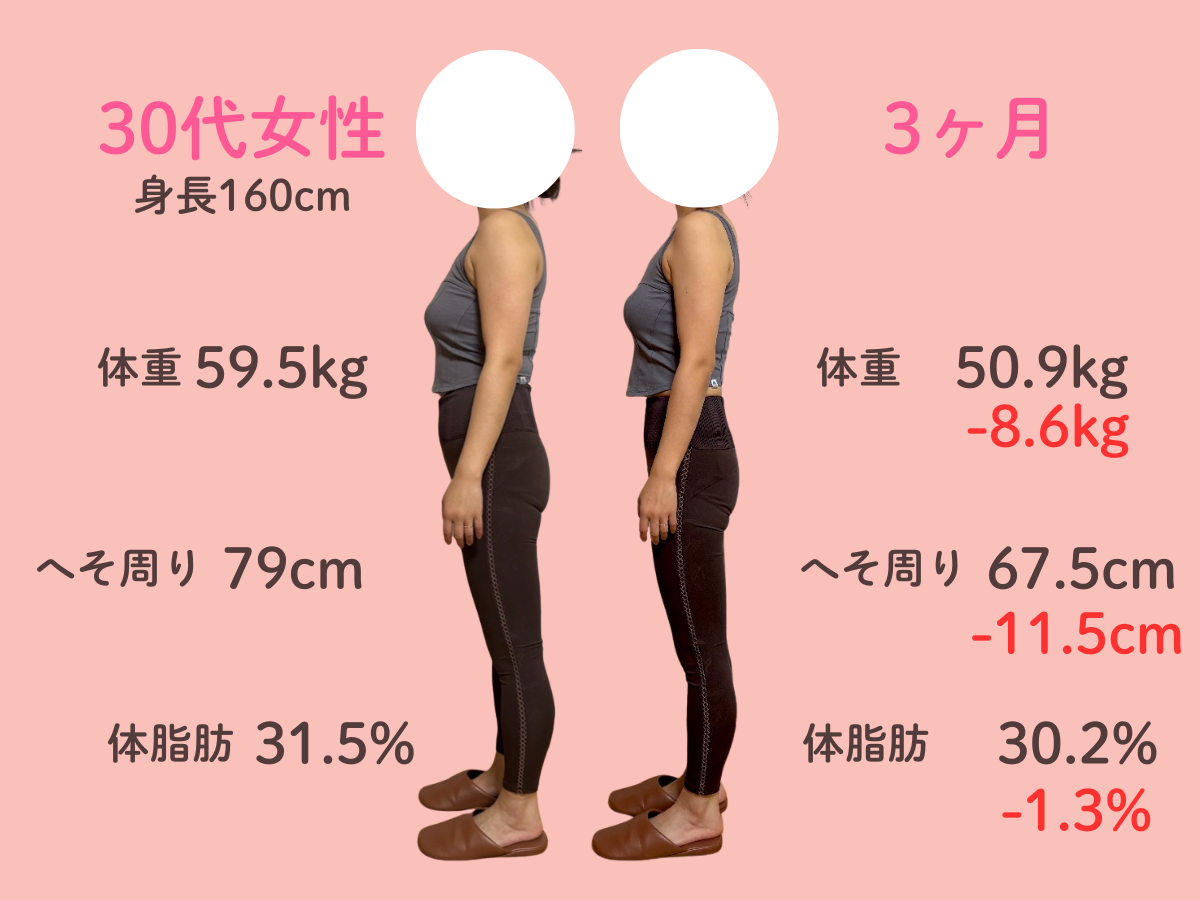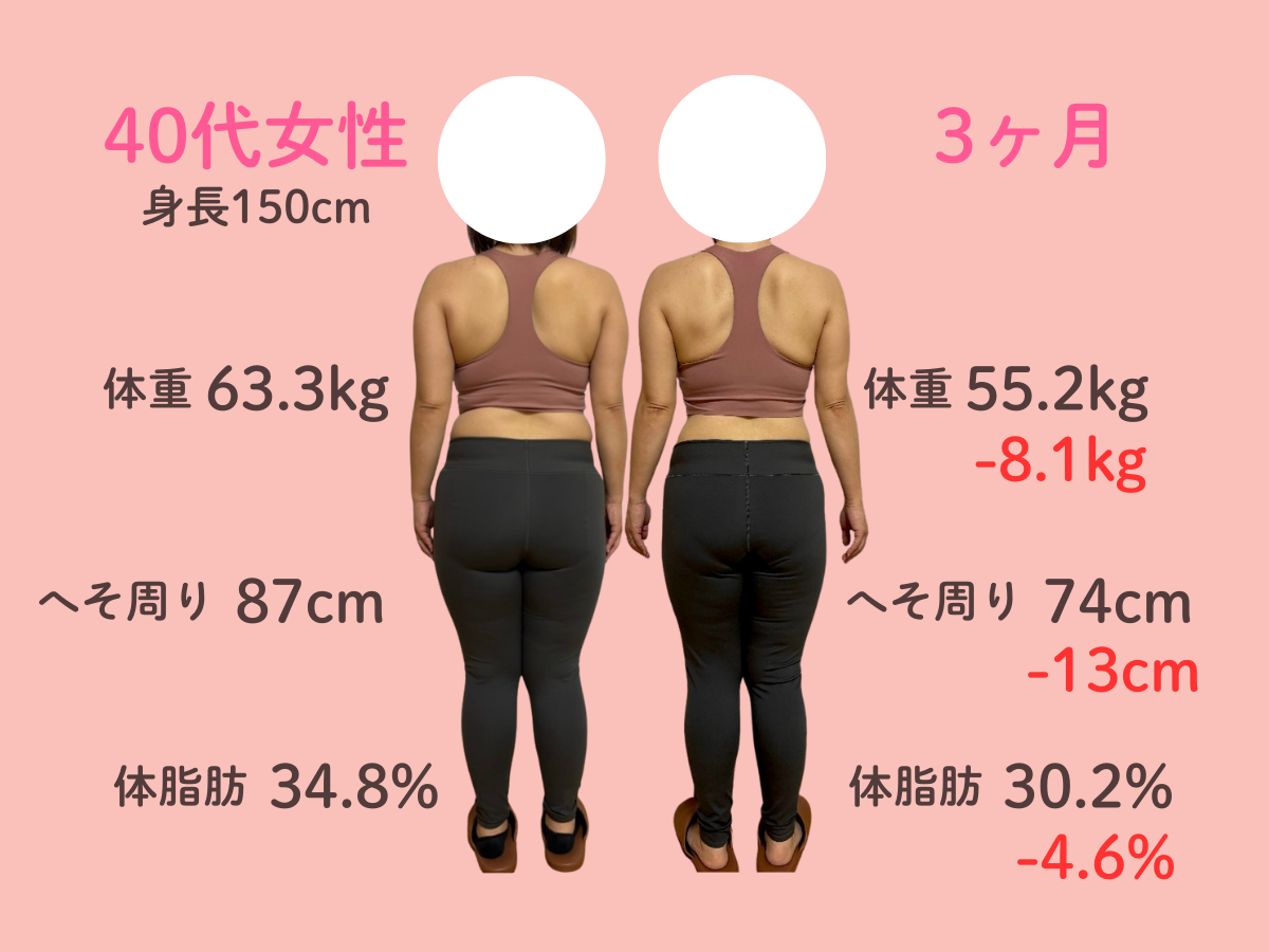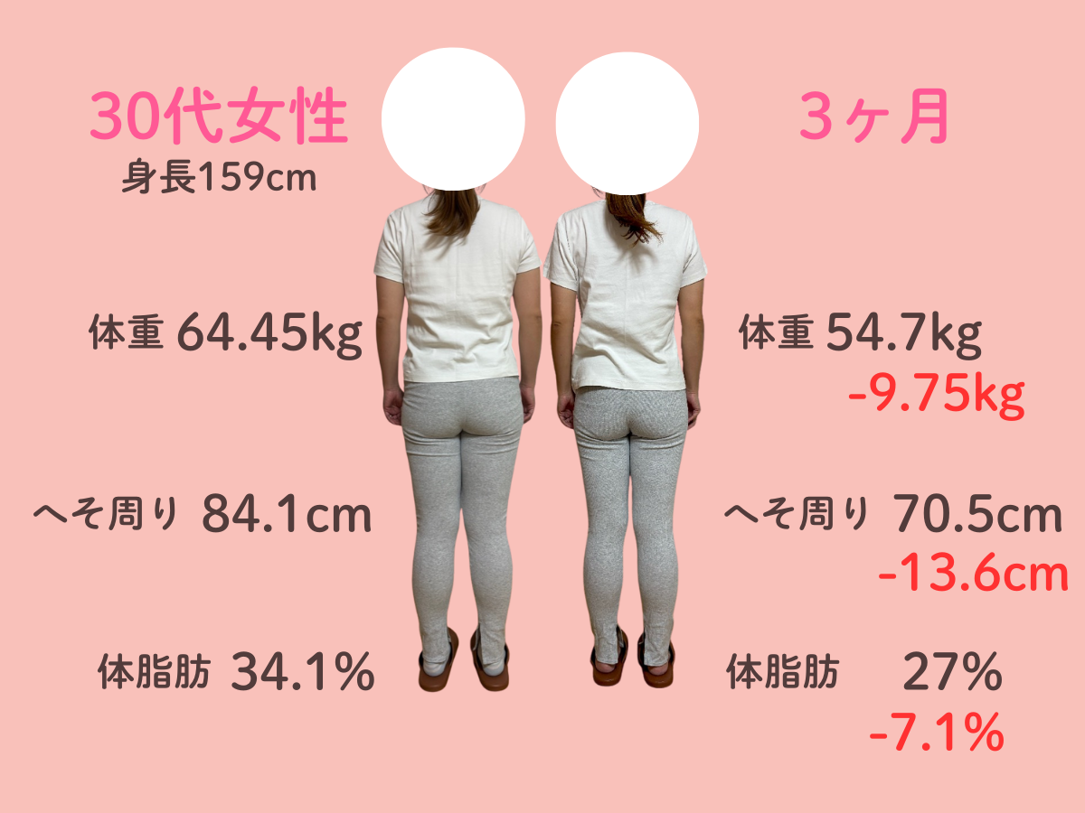 お腹の脂肪が多く体重が増え続けて、太っているためTシャツ等ピタッとするものが着れなくなって悩んでいました。 自分では運動やウォーキングを始めのに体重にも体型にも変化はありませんでした。 そんな時に、チラシで3ヶ月10kg痩せるという言葉を見てすぐに来ました。 食事制限が厳しくなくて、何でも食べることができて薬やサプリメントの服用がなかったこともよかったです。 3ヶ月終わってみると、体重がどんどん落ちて嬉しかったです。 体全体がひとまわり小さくなりました。 洋服のサイズもLLからLかMが着れます。お腹のぜい肉が取れて体が楽で動きやすいです。人前に出ても体型での恥ずかしさがなくなりました。 この調子でもう1ヶ月頑張ってみることにしました!
