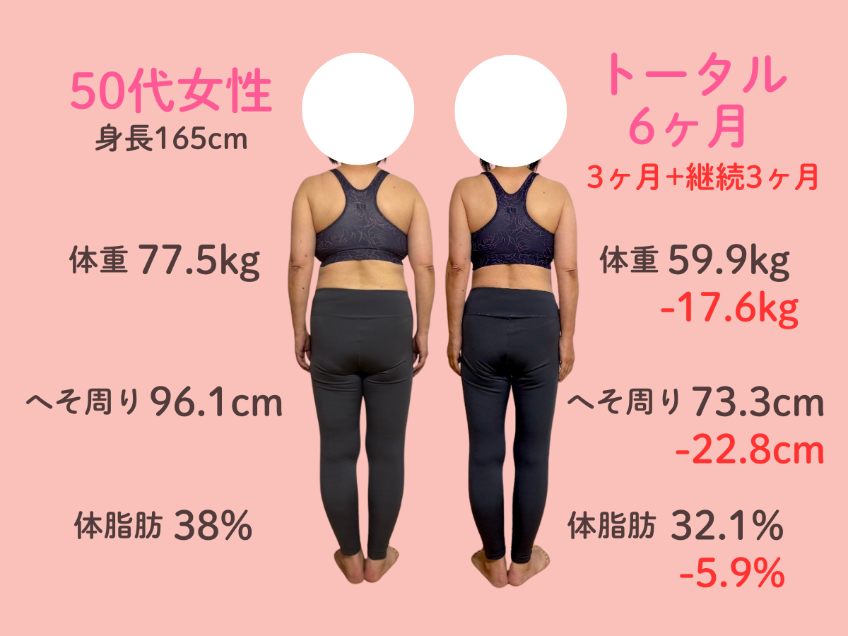 「やせたい」と常に思っていましたが、なかなか実行できず…ダイエット器具、サプリ、エステ、トータルしたら、どの位お金を使ってんだろう。 そんな時、「これが最後のダイエット」というフレーズに心を動かされました。カウンセリングを受けて、とにかくやってみたいと思いました。一番これならできそうかもと思ったのは自分だけ違うものを食べなくてもいい。家族と同じ食事を作りながらできることでした。不安もたくさんありましたが、あやかさんと二人三脚で、1つずつクリアできることで、自信になりました。みるみる体重が減ることにモチベーションもあがり、続けることができました。3ヶ月終わった後の写真を見たら、欲が出てきてもう少しやせたい!と思い、もう3ヶ月続けてトータルで17kgのダイエットに成功しました。着れる服でなく、着たい服が着れ、今まで嫌だった写真を撮ることも嫌でなくなりました。本当に"人生変わった~!"って思っています。確かに、最初に金額を聞いた時は決して安い金額ではありませんでしたがダイエットプログラムを終えてみると、健康についての知識やリバウンドしないための知識なども教えていただき、長い目で見たら、ぜんぜん高額ではなかったと一生の宝物になったと思いました。やらない理由を考えるより、悩んでいるなら、一歩踏み出してみてください!