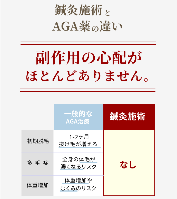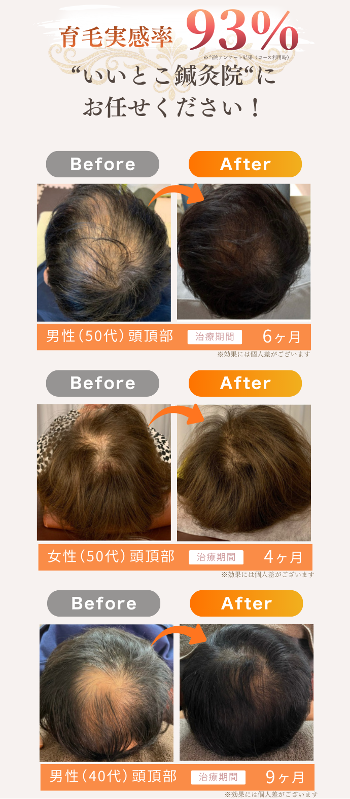 内服薬は副作用が出てやめていたのですが、育毛鍼は副作用がないのが魅力で通い始めました。最初は育毛鍼で大丈夫なのかな?と半信半疑な部分は正直あったのですが 4ヶ月目に抜け毛が明らかに減少しました!朝の枕に落ちてる髪の量が全然違うので気分が落ち込まず朝を迎えれています! 内服薬は合わなかったので育毛鍼が自分の身体にとても合ってました! また今後もよろしくお願いします!