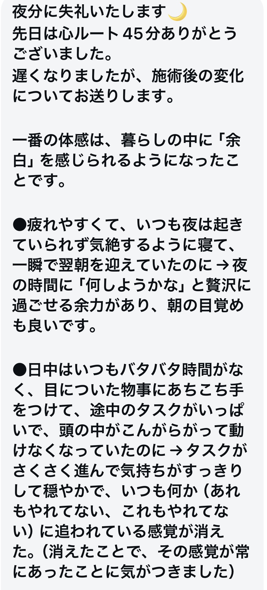 普段はルート治療をお願いしていますが、今回初めてルート指圧整体を受けました。 自宅で朝晩とストレッチをしていても慢性的に首や肩、背面がガチガチの状態でふくらはぎはパンパンに浮腫み、睡眠の質も悪く頭も重く体全体が重い状態で伺いまいた。 施術を受けてる途中から軽くなっていくのを感じ終わった後には全身が別人のように軽くなっていて「私の体はこんなに軽くなるんだ!」とビックリしました! 疲れ切ってどんよりしていた顔が施術を受けたら目は大きく開きキラキラしていてとても嬉しくなりました! ずっと睡眠が浅く睡眠不足の状態が続いていたのですが帰宅途中から眠くなってきて久しぶりにまとまった昼寝ができとてもスッキリしました! ストレッチ時に首や背面の可動域が広がっていて驚きました!施術を受けてから1か月経ちますが広がったままです! 本当にありがとうございました!