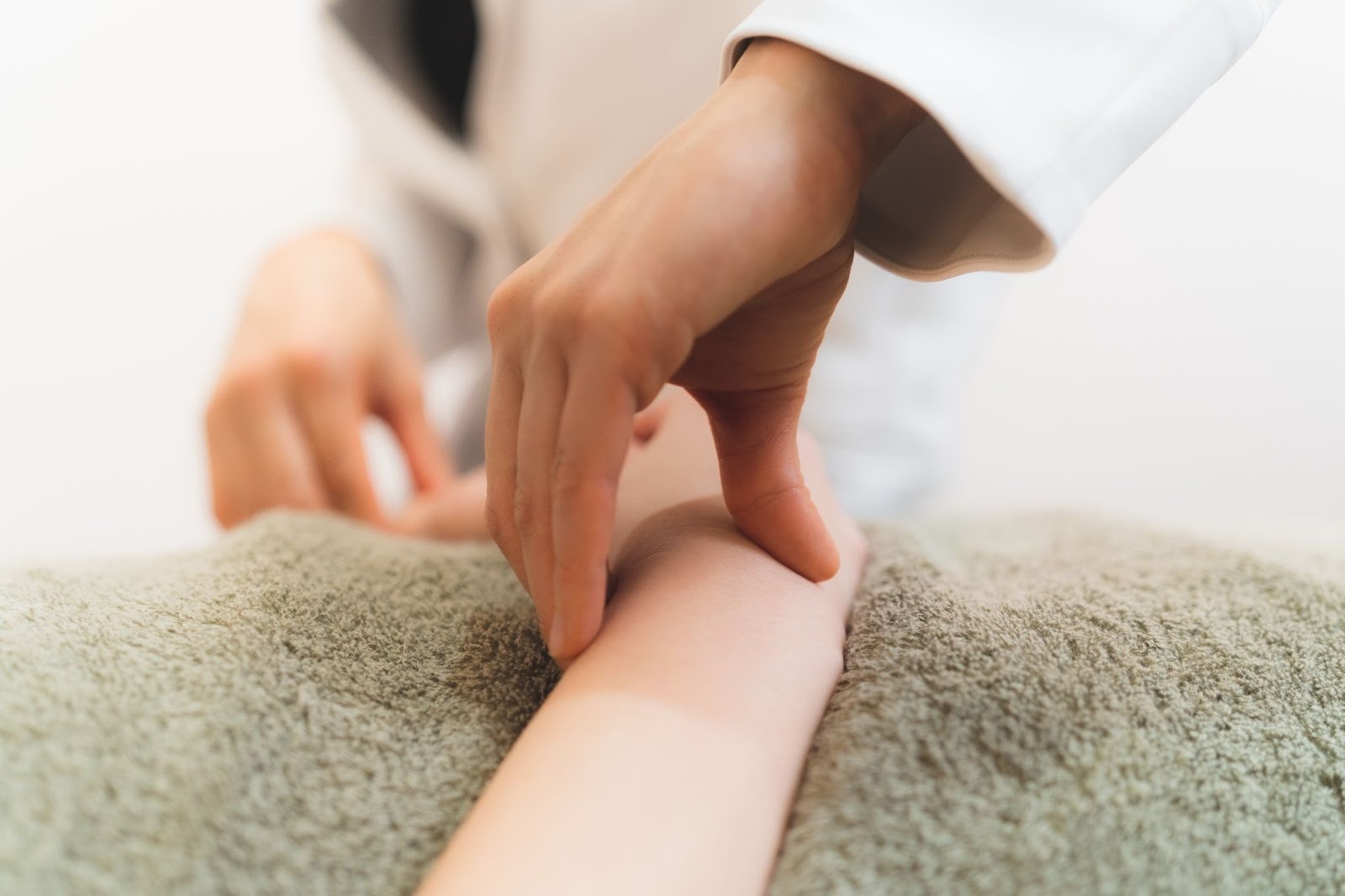 問診の後、実際に体に触れて筋肉の硬さや緊張の度合い、しこりの位置、体の歪み、関節の動きなどを丁寧にチェックします。