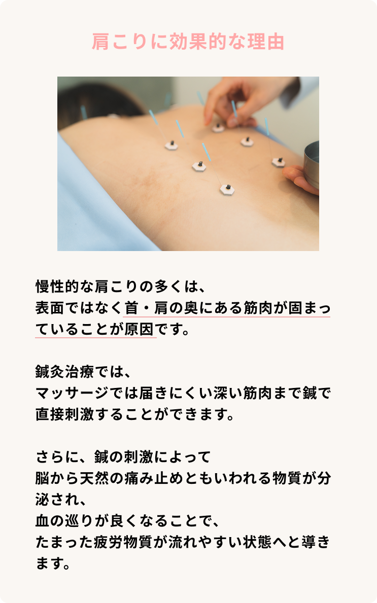 鍼の刺激によって脳から天然の痛み止め物質が分泌され、薬を使わずに痛みを緩和できるほか、副交感神経が活発になることでリラックス効果も得られ、血行改善により自己治癒力や免疫力もアップします。