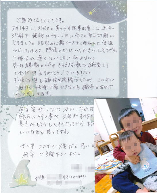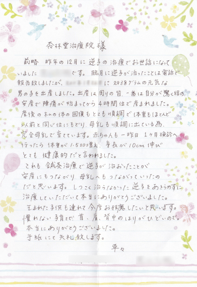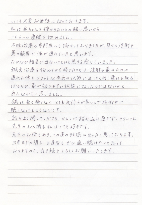 不妊には鍼治療がいいと聞き、友人のすすめで杏林堂治療院さんで鍼治療を受けました。 最初の施術で、体がポカポカして肩こりが改善されすぐ効果が実感できました。 そのため週1回のペースで通院をすることにしました。 施術は鍼を刺したかどうかもわからないくらいで痛みもありません。 ベットの上でとてもリラックスして寝てしまうこともしばしばでした。 ストレスが大敵の不妊治療にはとても良いと実感しました。 通院から半年ほどで子供を授かることができ、そのあとも定期的に通院しています。 妊娠中、お腹が大きくなるにつれ肩こりや腰痛も出てきましたが、逐一対応していただき 快適な妊娠期間を過ごすことができたように思います。 施術してくださるのが女性の先生だったので、とても安心できますし 時々お話も聞いていただいたりして通院するのがとても楽しみでした。 私は病院での不妊治療と並行して鍼治療を受けてよかったと思っています。 もし、迷われてる方がいらっしゃったら一度施術を受けることをおすすめします。