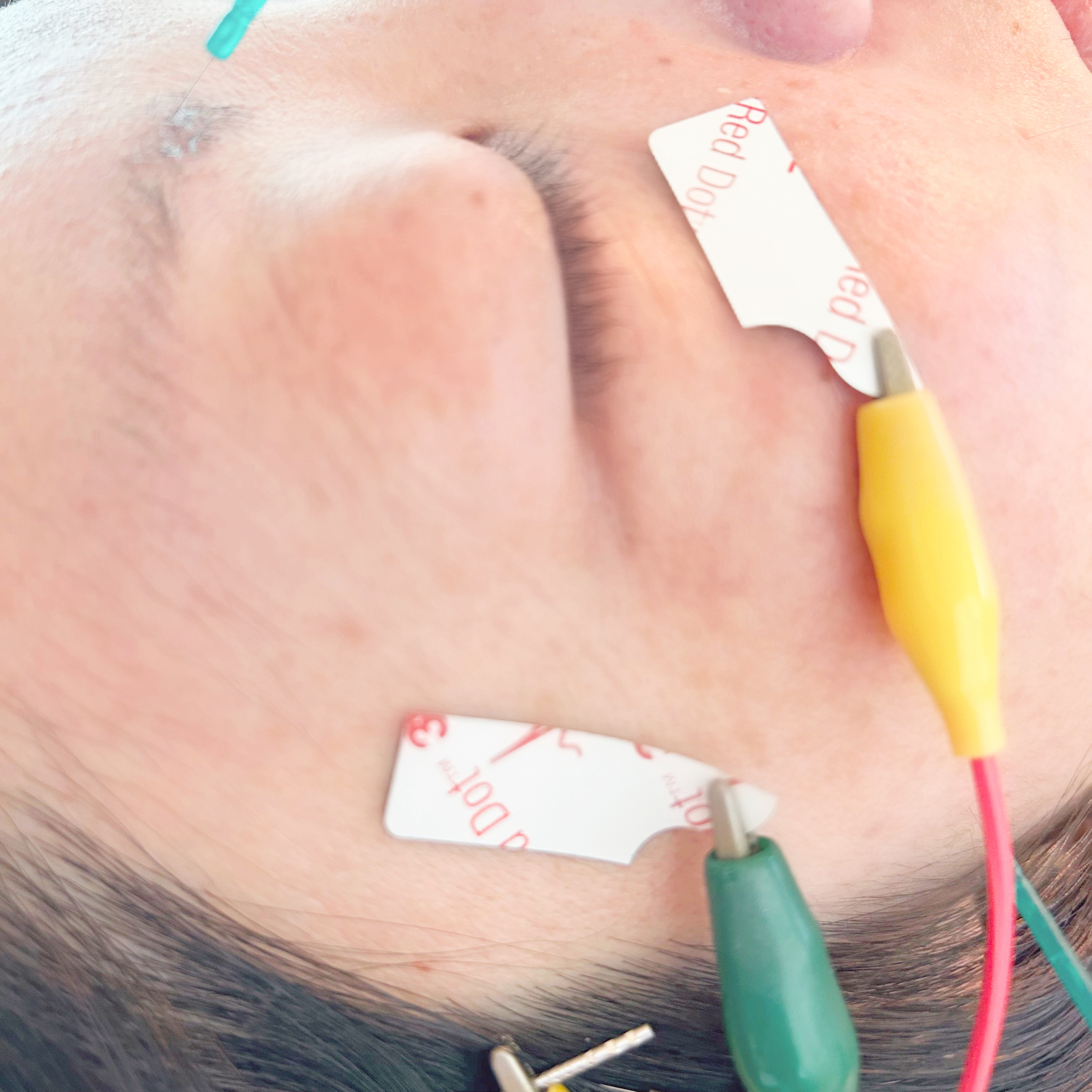 当院では側頭筋に電気刺激を与えてコリをほぐしたるみにアプローチします。